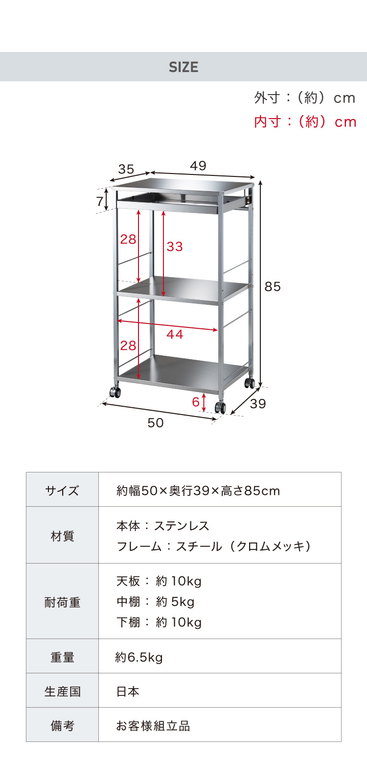 日本製 燕三条 ステンレス作業台ワゴン 幅50cm 引出し付き キッチンワゴン 調理台 キャスター付き 引き出し付き 棚 ラック スリム キッチン収納 代引不可