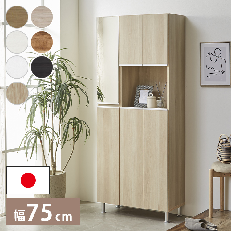 シューズボックス ハイタイプ ミラー付き 国産 大川家具 完成品 幅75cm 高さ175cm 奥行35cm 靴箱 シューズラック 鏡付き 北欧 木製 大容量 スリム 代引不可
