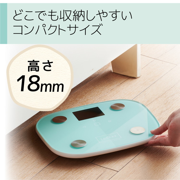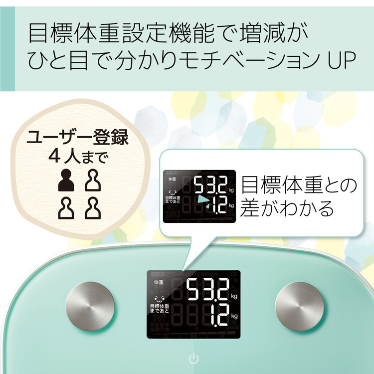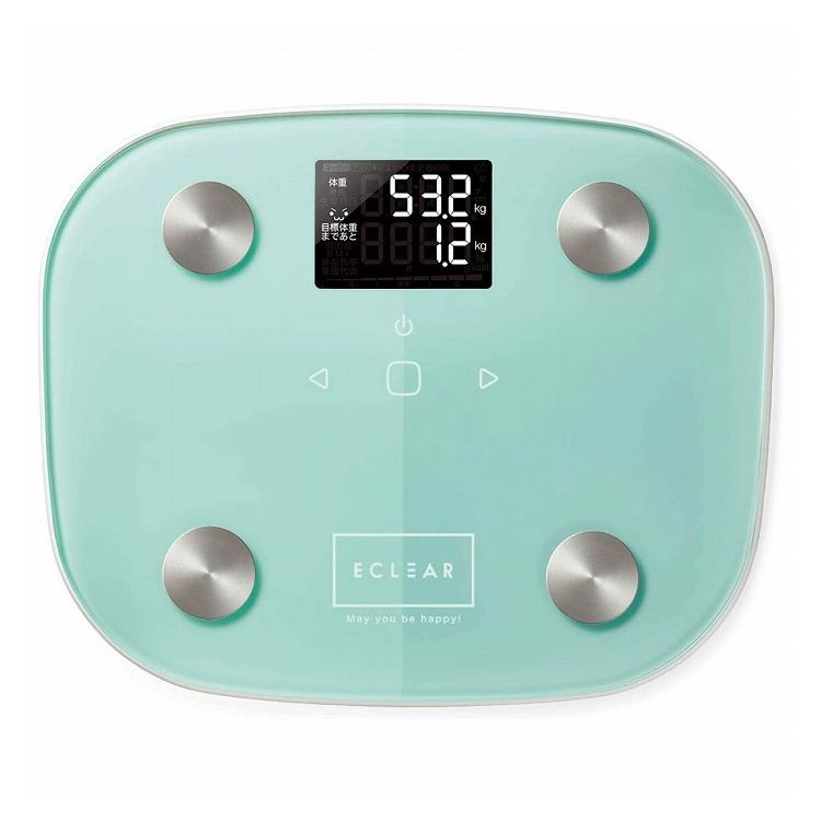 目標体重設定機能と顔文字表示で毎日の変化が見える“ECLEAR 体組成計”です。MRI測定データに基づき体組成データを算出する体積推定方式を筑波大学と共同で開発。 目標体重設定機能搭載で測定後に目標との差を表示。顔文字表現により体重の増減がひと目で分かります。体重は100グラム単位で測定が可能。体重・BMI・体脂肪率・基礎代謝の4項目が測定可能です。
