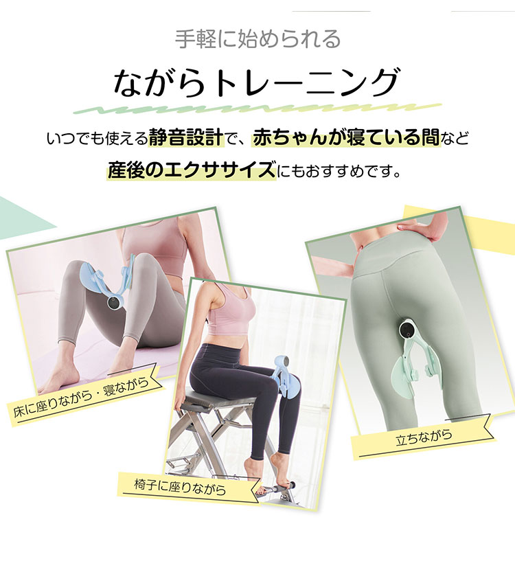 内ももにギュッと挟んでパタパタと脚を開閉するだけで効率よく内転筋と骨盤底筋を鍛えられます。強度も4段階調節でお好みの負荷で使用可能