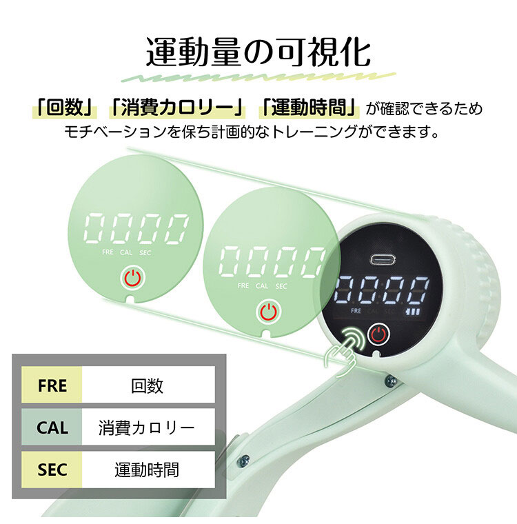 便利なメーター付:回数・消費カロリー・運動時間を確認可能
