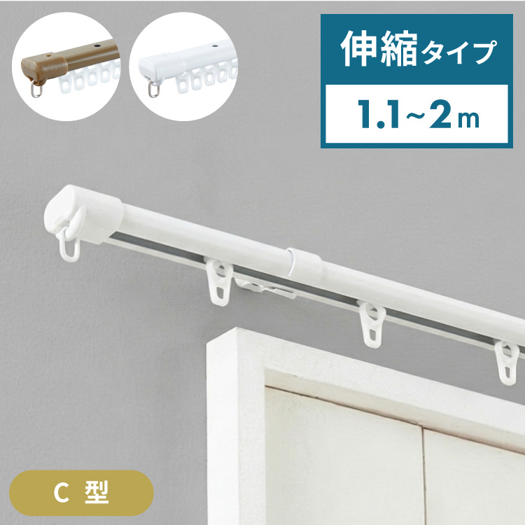 C型 カーテンレール シングル 1.1~2m 伸縮カーテンレール 2.0m 伸縮 スチール製 天井付け 正面付け 取付簡単 伸長式 窓回り カーテン 賃貸 代引不可