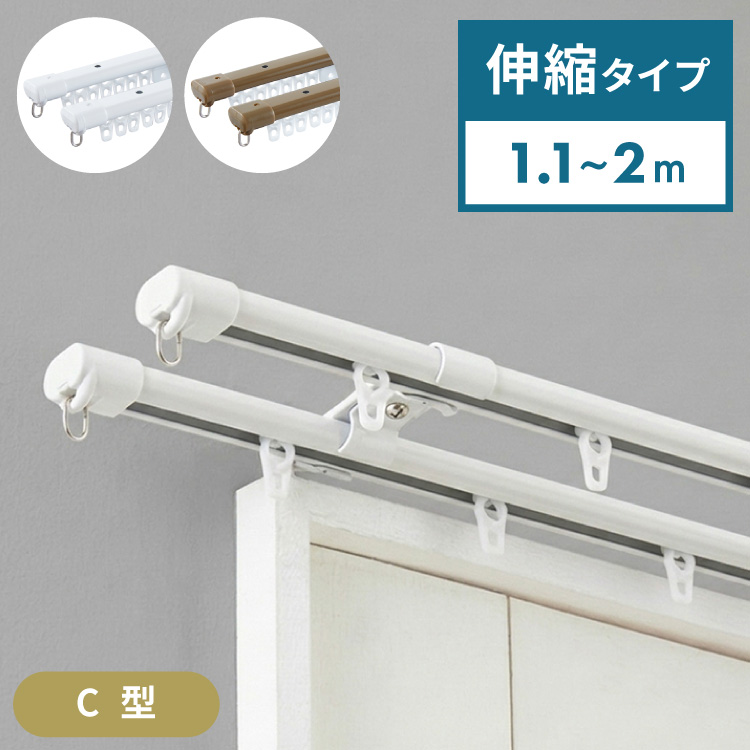 C型 カーテンレール ダブル 1.1~2m 伸縮カーテンレール 2.0m 伸縮 スチール製 天井付け 正面付け 取付簡単 伸長式 窓回り カーテン 賃貸 一人暮らし 代引不可