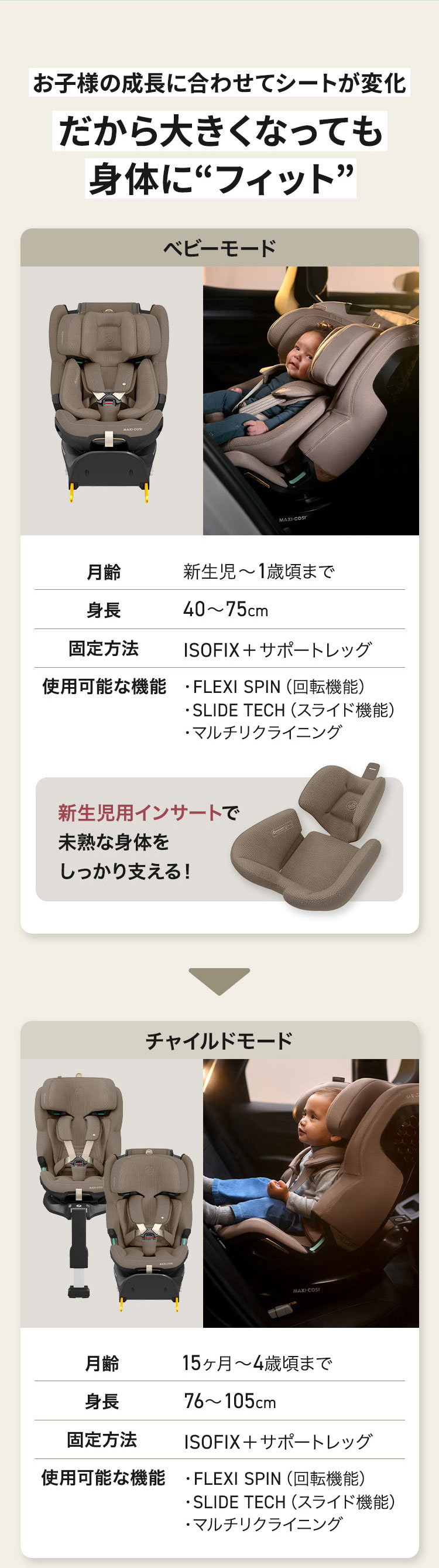 製品ご購入日より4年間(樹脂および金属部品)/1年間(縫製品/ウレタンフォームおよび乳児ベルト)の製品保証付き