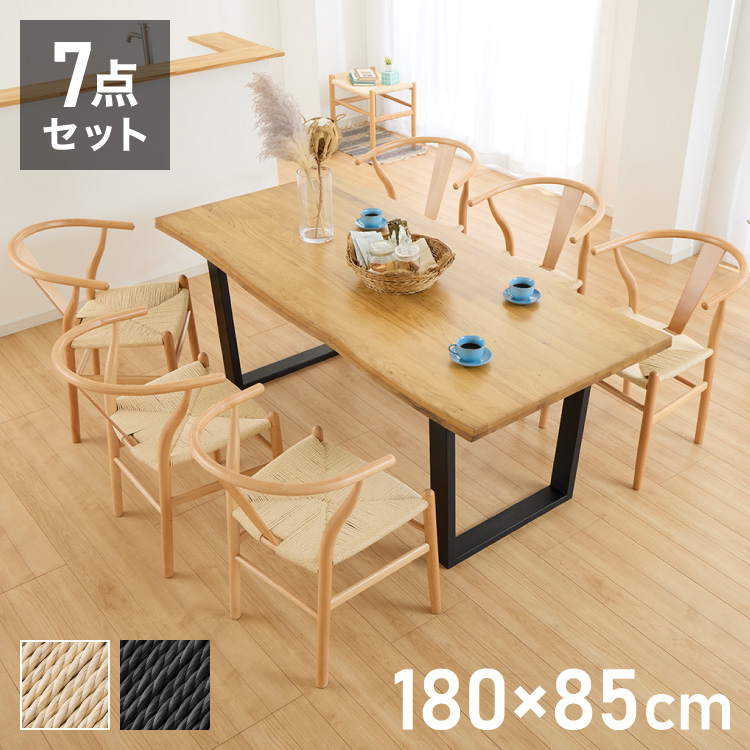 一枚板風 ダイニングテーブルセット 幅180 テーブル+チェア6脚 7点セット 6人掛け 天板浮造り仕上げ オーク無垢材 台形脚 北欧 ペーパーコード 代引不可