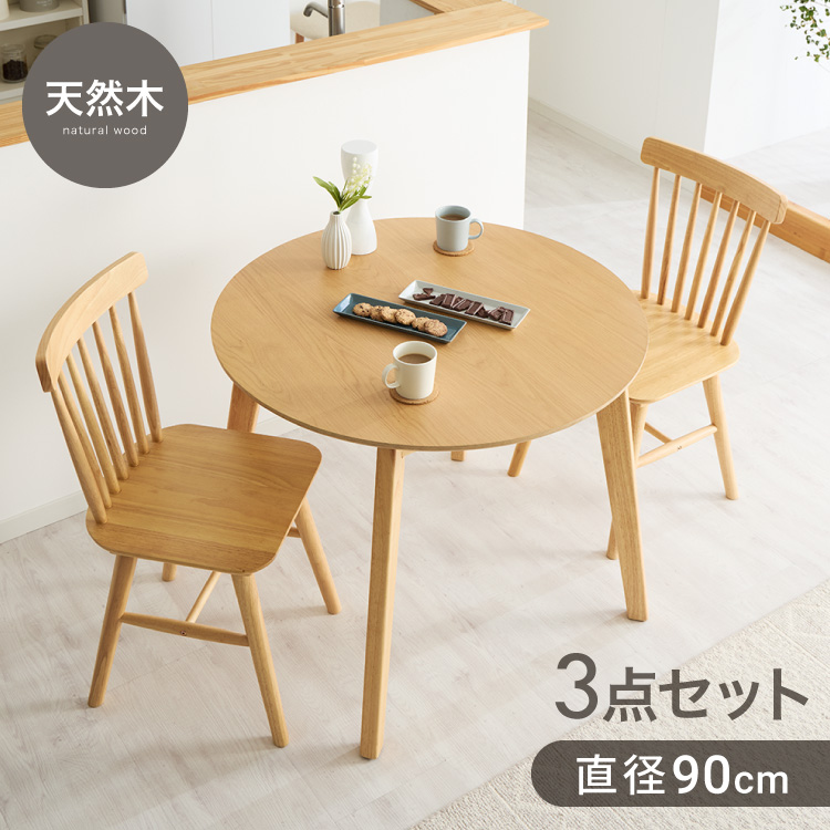 カフェ風 ダイニング3点セット 2人掛け 円形 90cm ダイニングチェア ウィンザーチェア 天然木 オーク突板 代引不可 レビュー報告でチェアクッション2枚