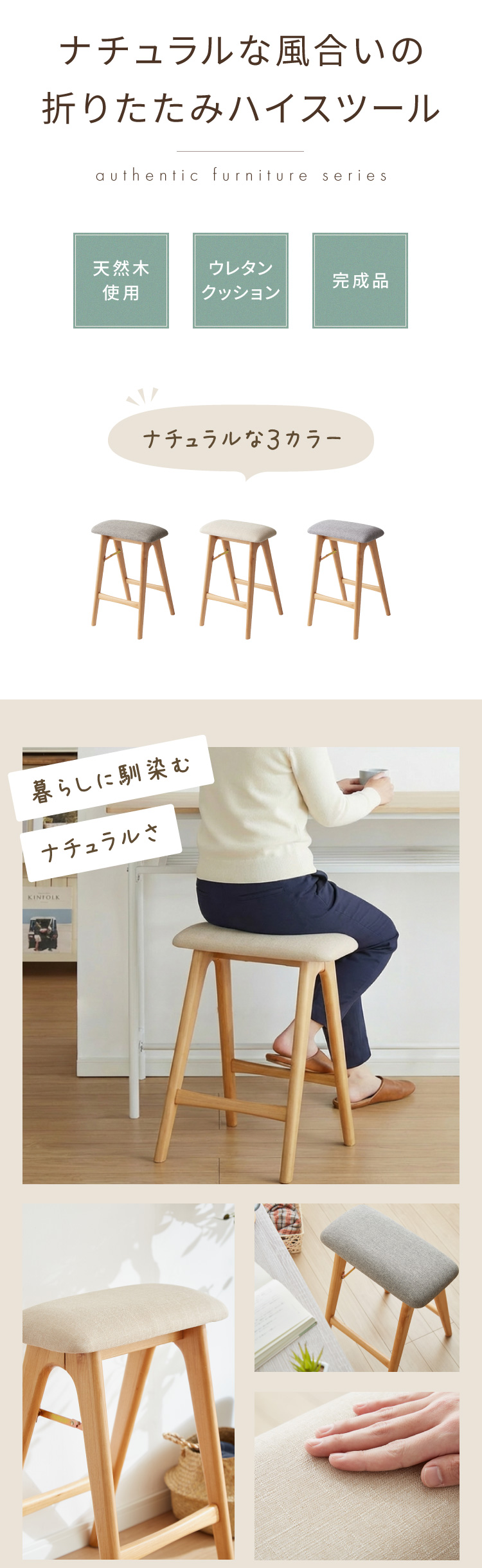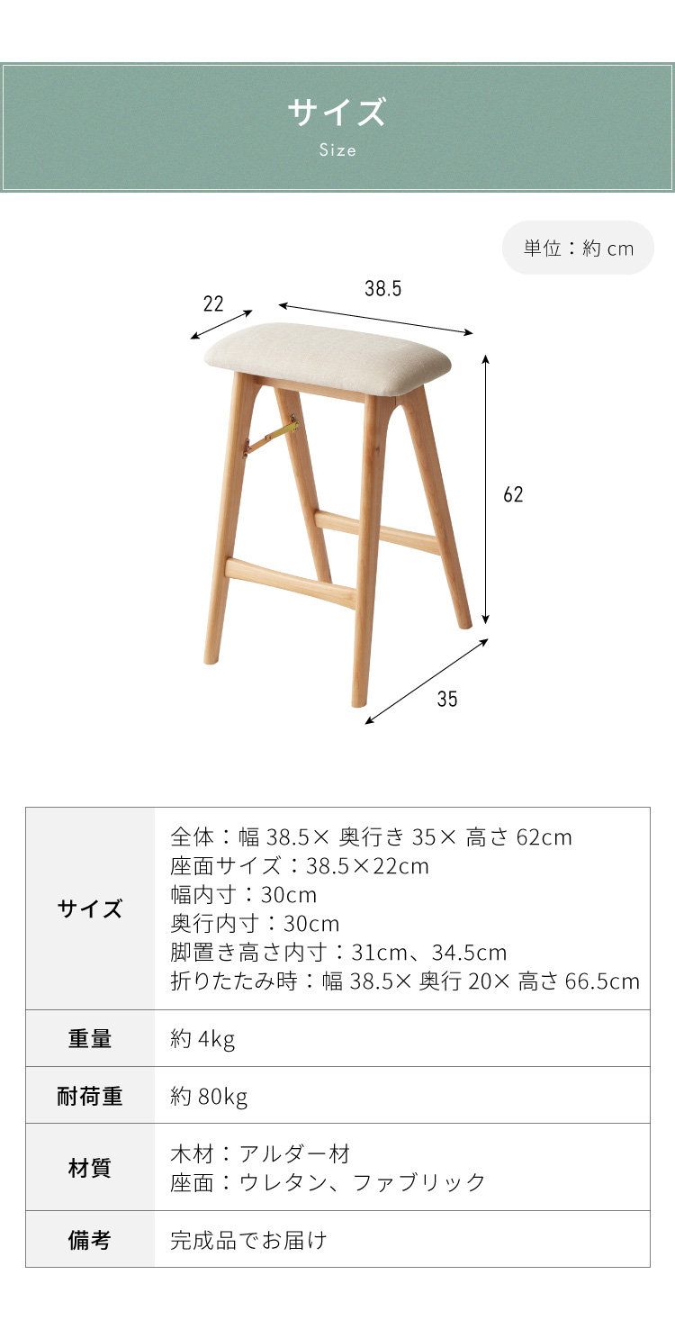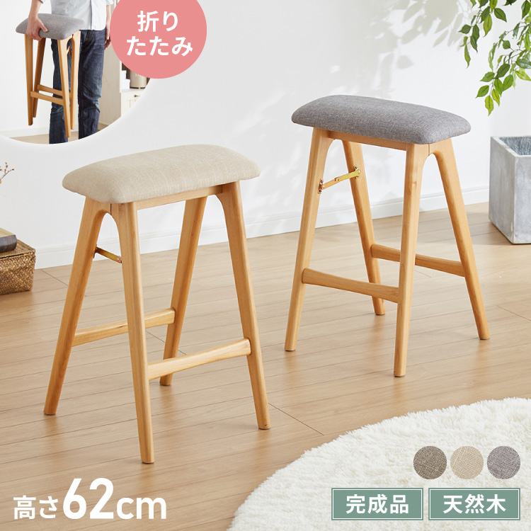 アルダー材を使った 折りたたみスツール サイン ファブリックスツール ハイスツール アルダー材 天然木 無垢材 ウッドスツール キッチンスツール