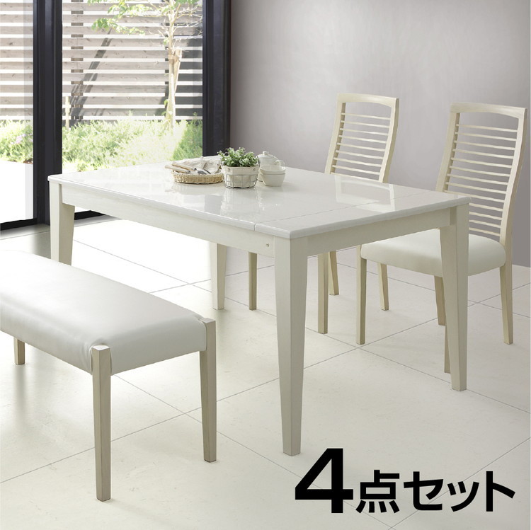 伸縮 ダイニングセット 4人掛け 4点セット ダイニングテーブルセット 伸長式 幅130~幅180 ホワイト 白 鏡面 ダイニングチェア ベンチ 食卓セット 代引不可