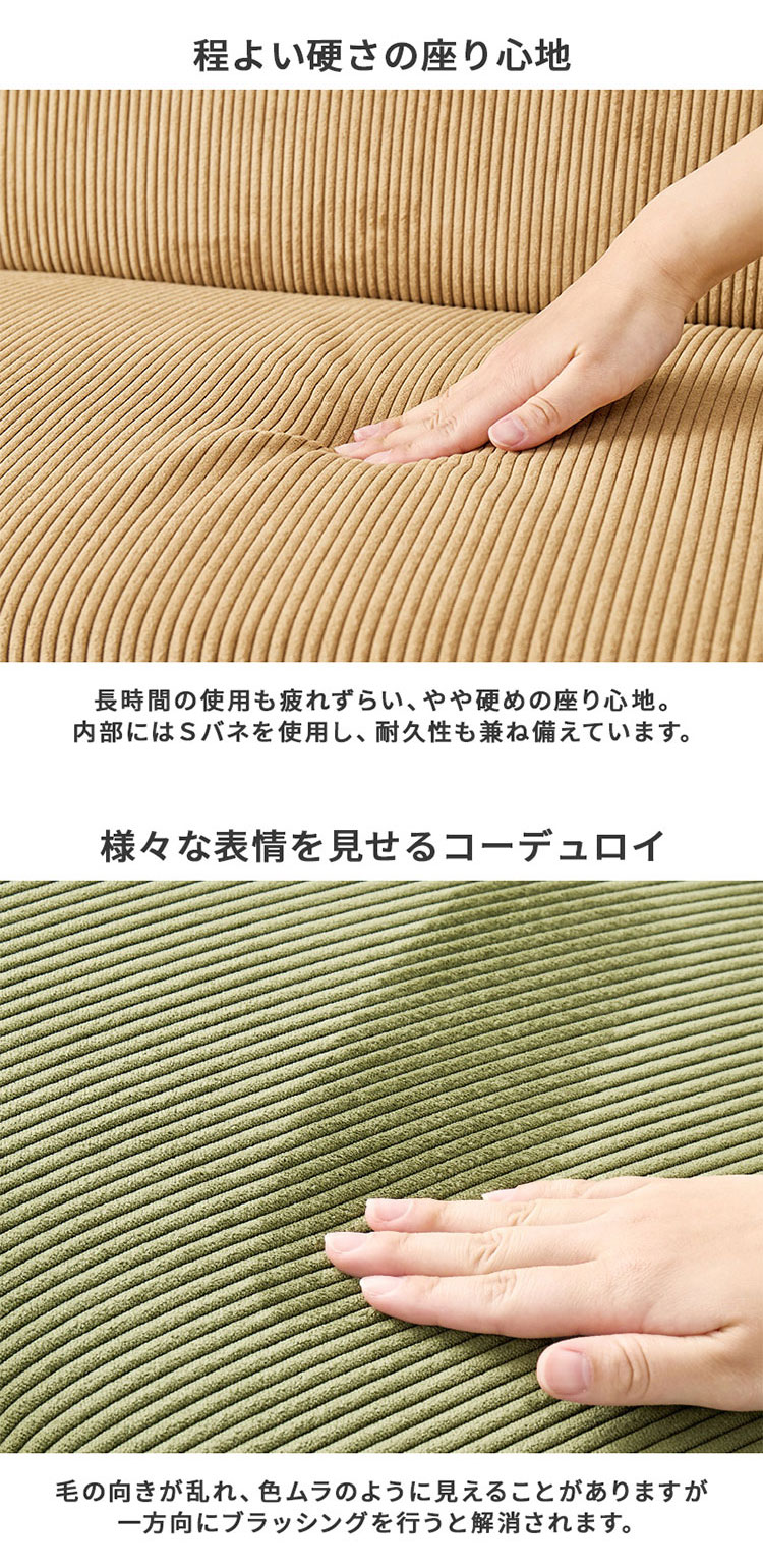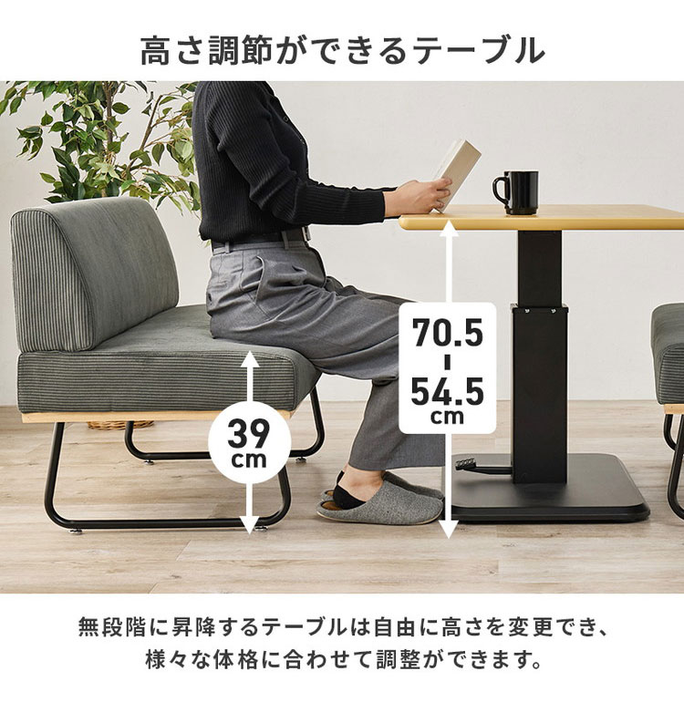 コーデュロイ生地のおしゃれなソファを合わせたダイニングセット。座面はやや低めで圧迫感を与えづらく、テーブルの天板は体格に合わせて無段階に昇降できます。