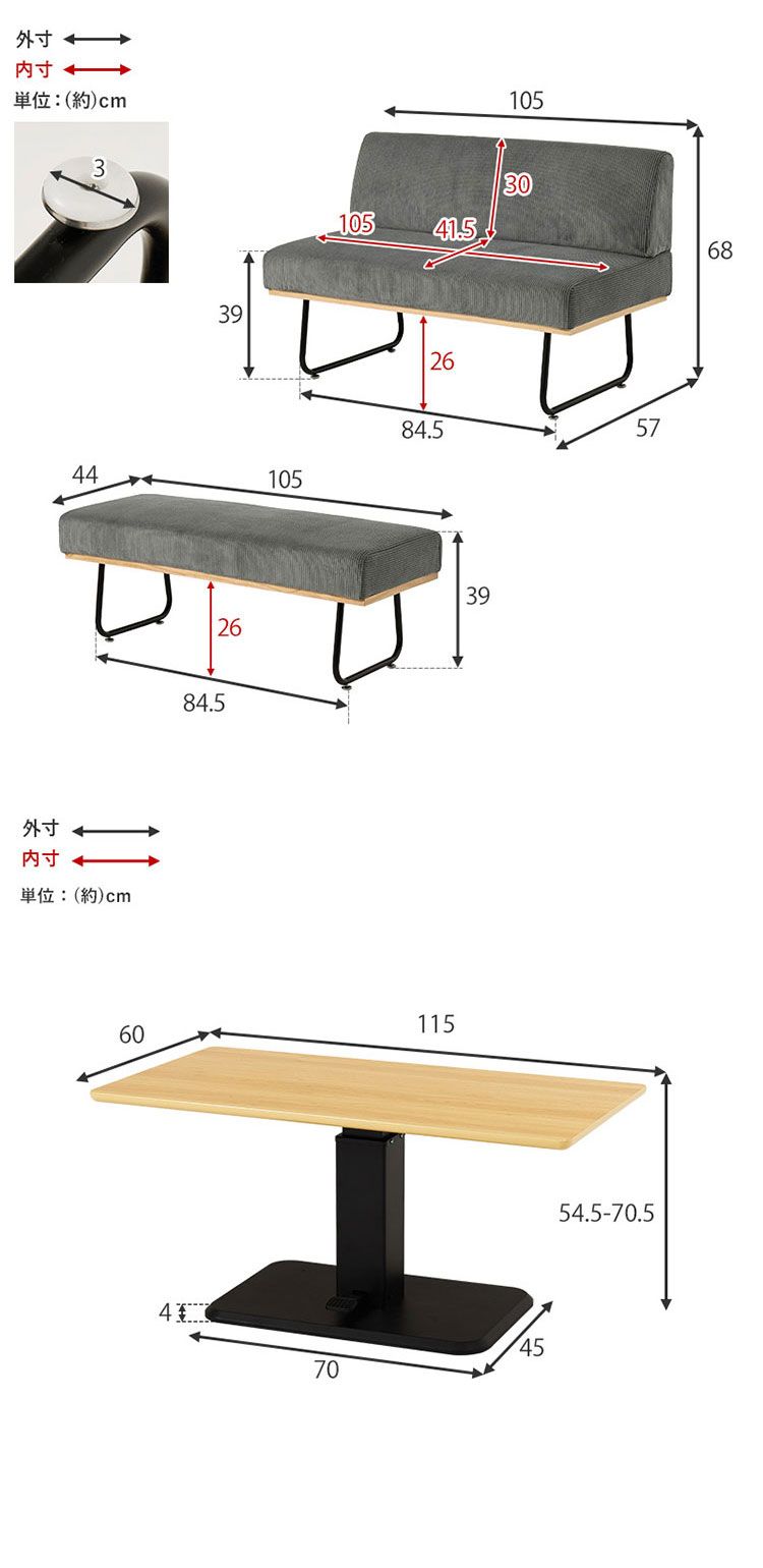テーブル:(約)幅115×奥行60×高さ54.5〜70.5cm、ソファ:(約)幅105×奥行57×高さ68×座面高39cm、ベンチ:(約)幅105×奥行44×高さ39×座面高39cm