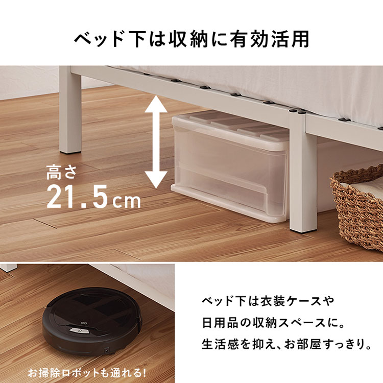 ネジを使わずパーツをはめ込む仕様なのでネジ頭が見えず、すっきりシンプルなデザインのシングルベッド。床面下は衣装ケースなどを入れて収納スペースにもなります。