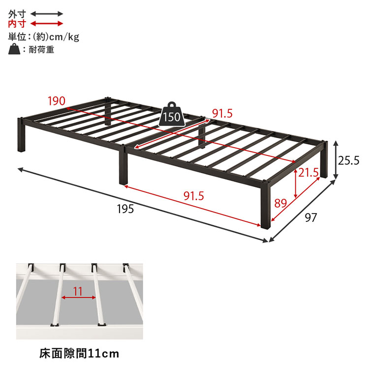 ベッド:(約)幅97×奥行195×高さ25.5×床面高25.5cm,マットレス:(約)幅97×奥行195×高さ14.5cm