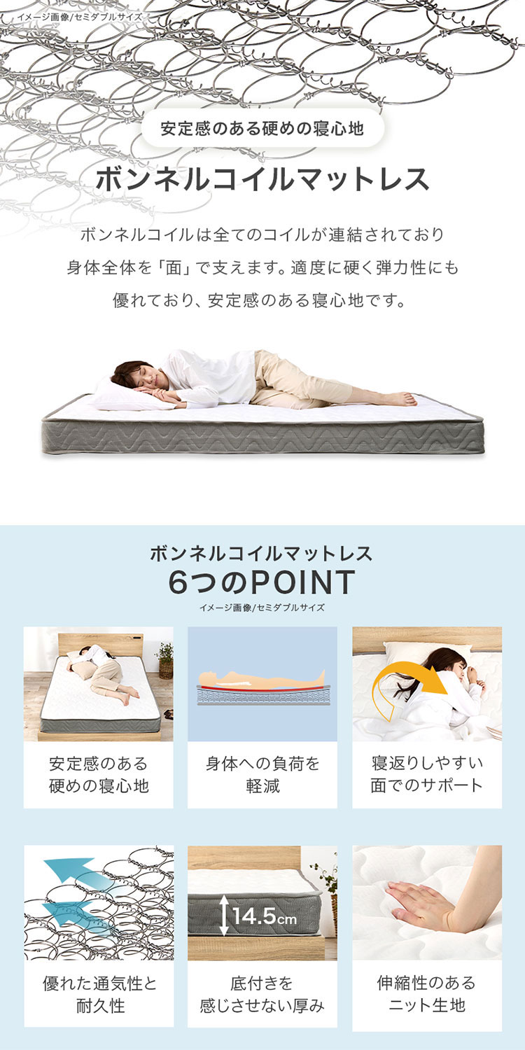 ネジを使わずパーツをはめ込む仕様なのでネジ頭が見えず、すっきりシンプルなデザインのシングルベッド。安定感のある寝心地のボンネルコイルマットレスセット