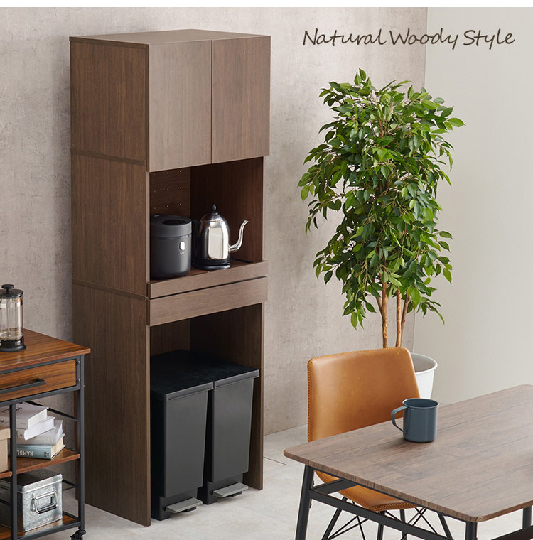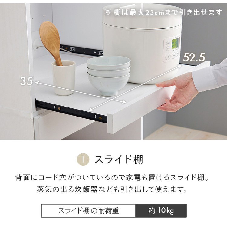 オープン部分と扉収納を合わせた多機能タイプでキッチンスペースを有効活用可能。引出しやスライド棚付きでキッチン家電も使いやすい。