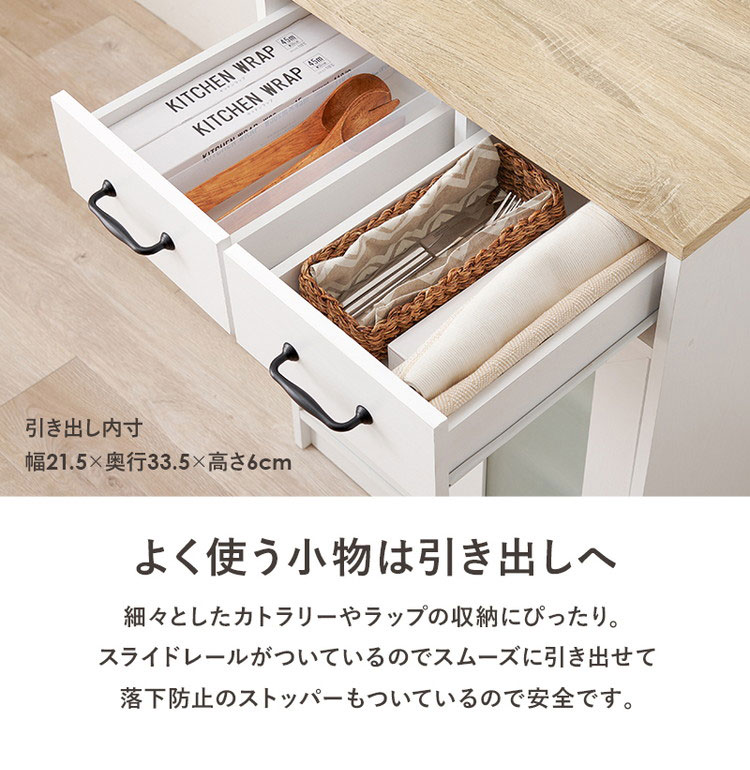 ワンルームにも置きやすいコンパクトサイズのキッチンラック。引出し付きで収納しやすく、作業台としても使いやすい高さがポイント。