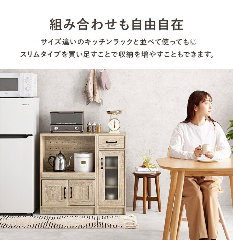 隙間に置けるスリムタイプのキッチンラック。扉付でホコリが入らず見た目もスッキリ。サイズ違いのラックと並べて使用も可能です。