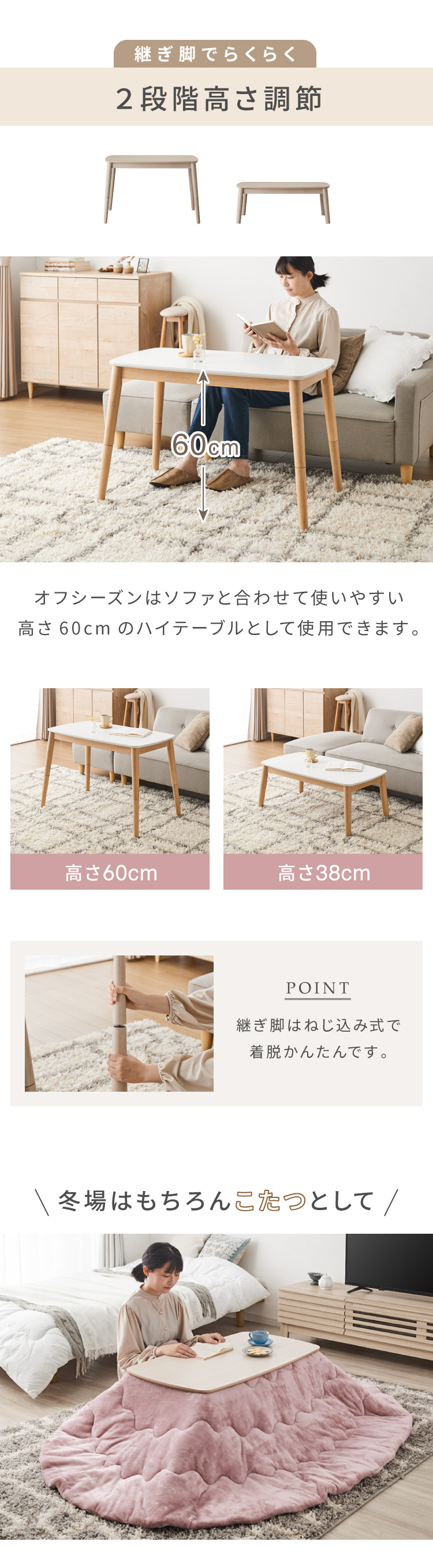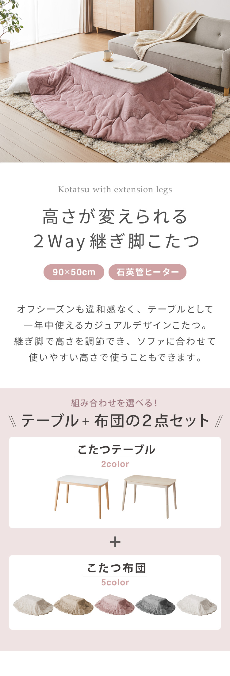 こたつ、こたつテーブル、カジュアルこたつ、炬燵、コタツ、ヒーター、暖房、ハイテーブル、ローテーブル、ソファテーブル、カフェテーブル、コーヒーテーブル、デスク、机、ハイタイプ、ロータイプ、継ぎ脚、高さ調節、伸縮、こたつ布団、こたつ、布団、セット