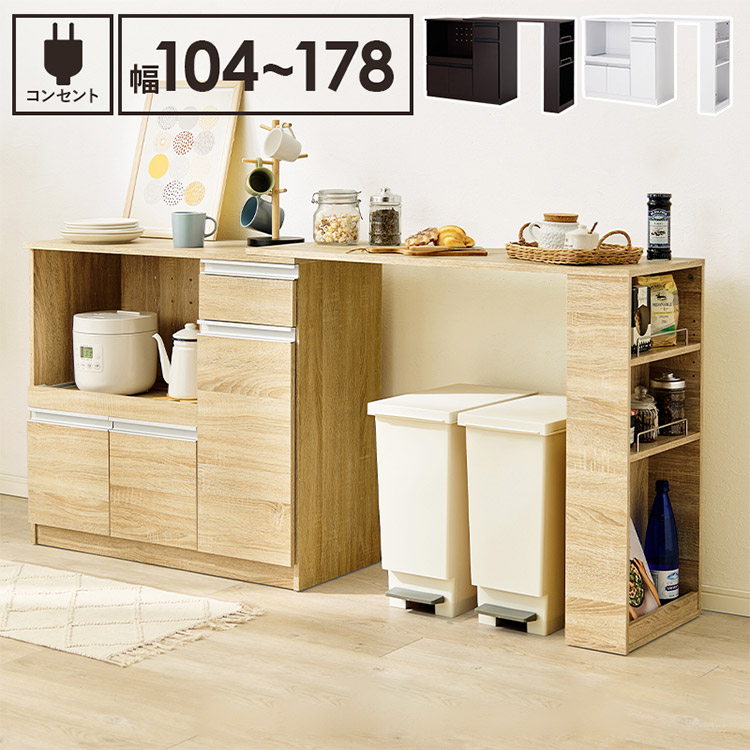 伸縮キッチンカウンター 2点セット 幅104~178 2口コンセント スライド棚 引出し 扉収納 代引不可