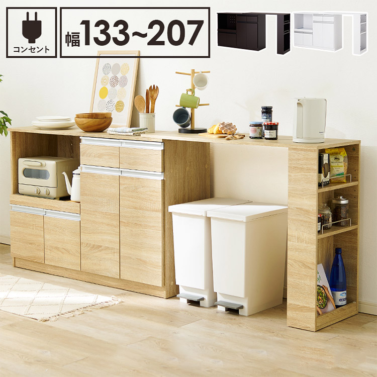 伸縮キッチンカウンター 2点セット 幅133~207 2口コンセント スライド棚 引出し 代引不可