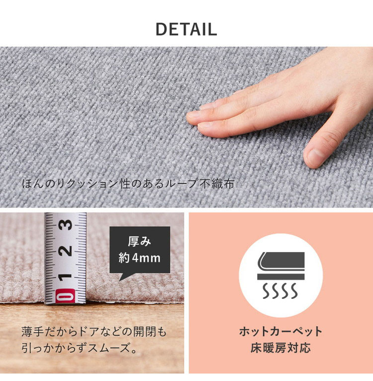 裏面が床にぴたっとくっつく加工で滑りにくい、吸着タイプの廊下敷きマットです。床のキズ防止や足元の冷え防止、足音などの防音対策に。ハサミやカッターナイフでカットできるため、お好きなサイズでお使いいただけます。毛足が短くお手入れもかんたん、汚れても手洗いOKだからいつも清潔に使え、お子様やペットと暮らすご家庭にもおすすめです。床暖房にも対応しています。