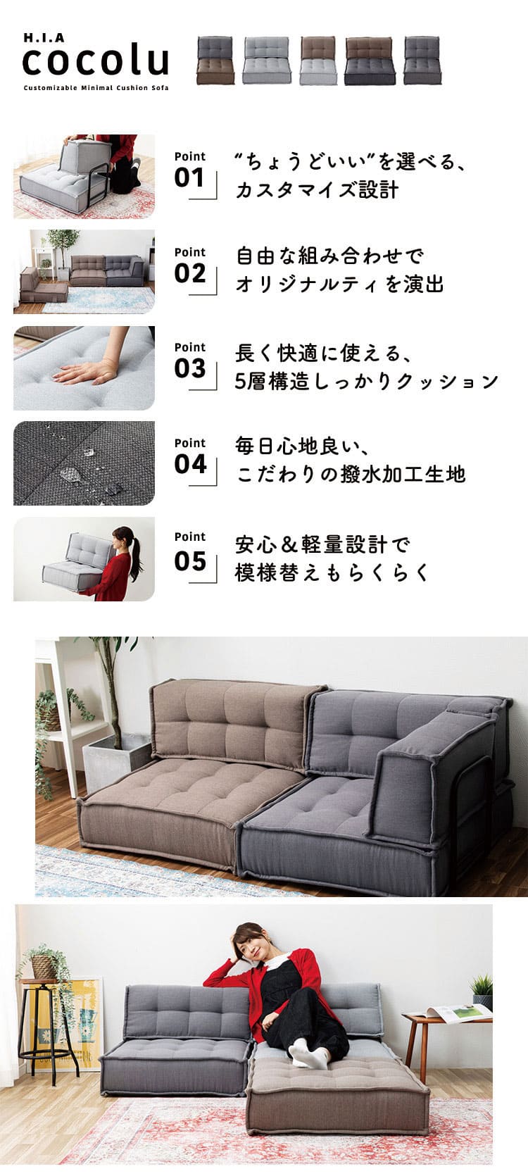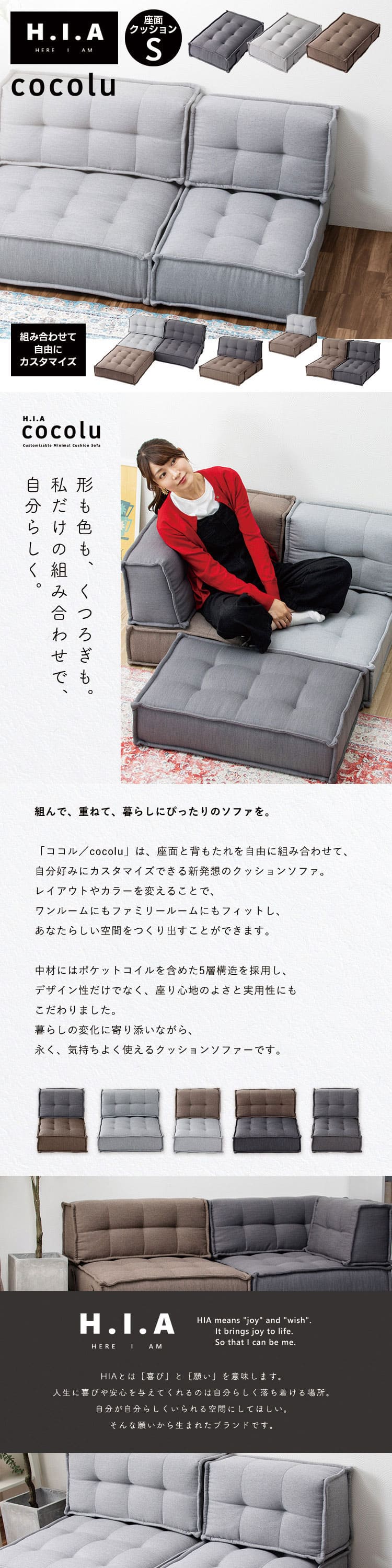 HIA カスタマイズできるミニマルクッションソファ- 座面 Sサイズ フロアクッション フロアソファー 組み合わせ自由 コンパクト 低反発 ローソファー 代引不可