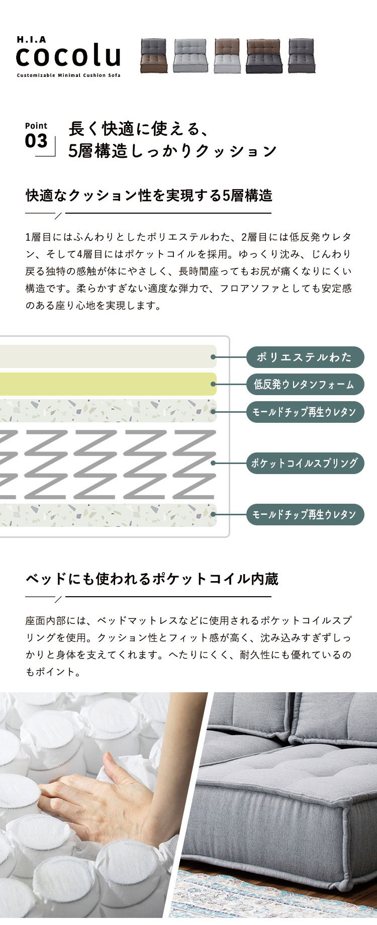 (座面構造)1層目:樹脂わた、2層目:低反発ウレタン(3cm厚)、3層目:ポケットコイル(6x8=48個)