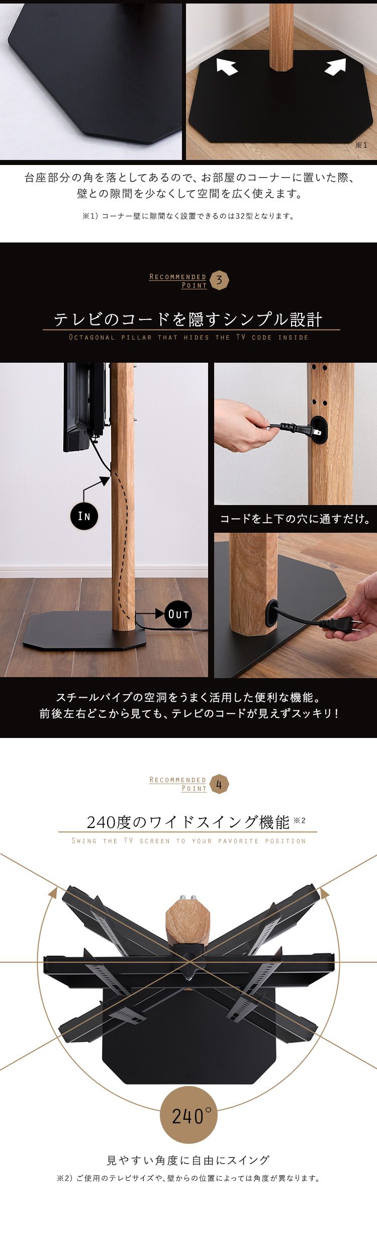 テレビスタンド ロータイプ ヴィンテージ 八角 スタイリッシュ スイング 角度調整 高さ調整 スチール 木目調 コーナー スタンド TVスタンド シンプル 代引不可