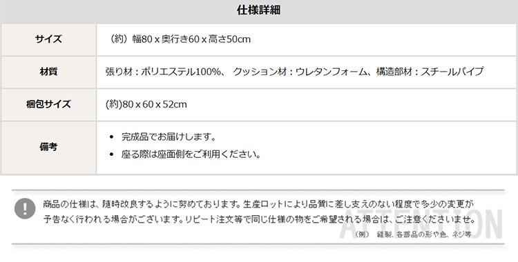 張り材:ポリエステル100%、クッション材:ウレタンフォーム、構造部材:スチールパイプ