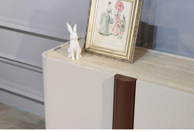 縦のラインが美しい白い扉と、温かみのある木製脚のコントラストが目を引くサイドボード。