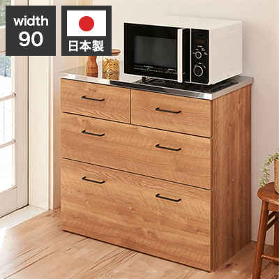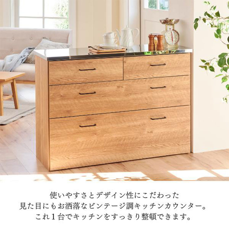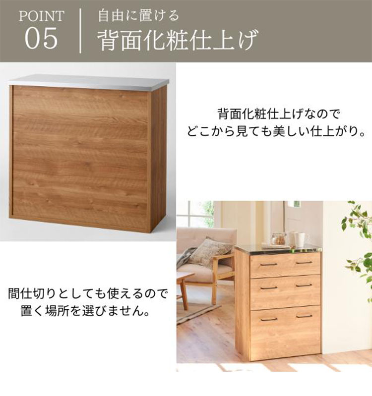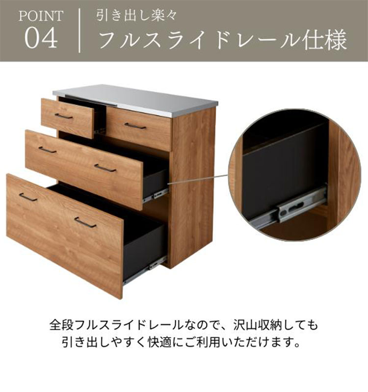 水や熱に強いステンレス天板のキッチンカウンター。汚れがサッと拭き取れます。引出しは1段目にはカトラリーなど小物の収納に便利です。全段フルスライドレール仕様で奥の収納物を取り出し易い仕様です。背面化粧仕上げですので間仕切りとしても使用できます。