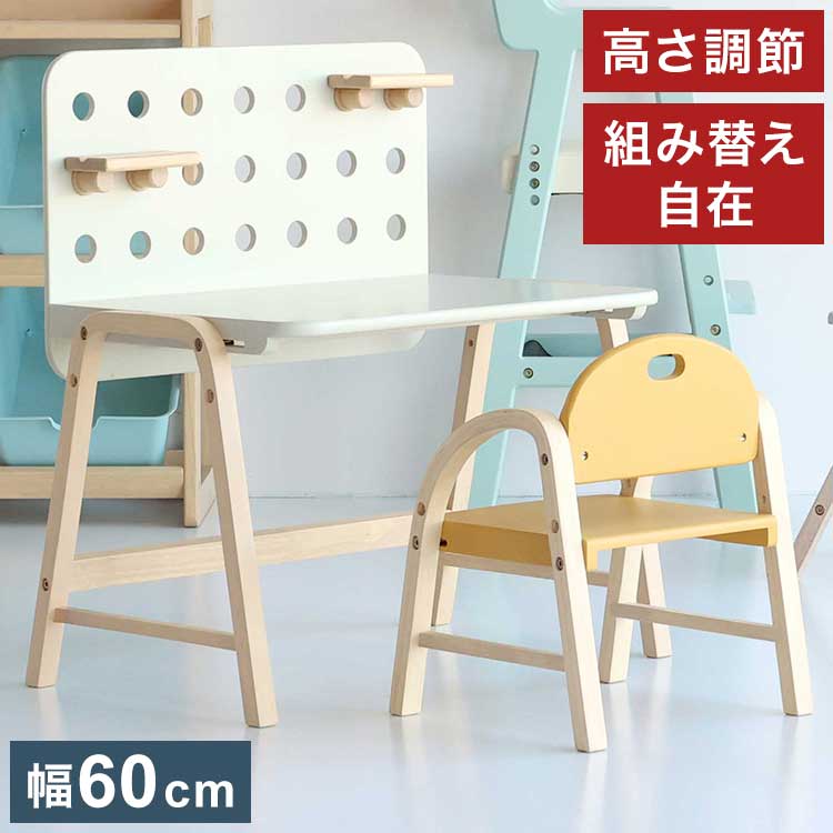 小さなお子様も自由に取付できる棚板が特徴的なキッズデスク。おままごとやタブレットスタンド、おもちゃ棚、ブックラックと自由にお使いいただけます。 2段階の高さ調節も可能です。