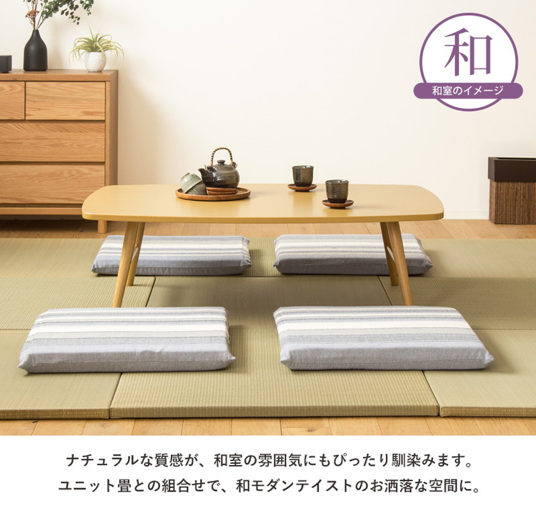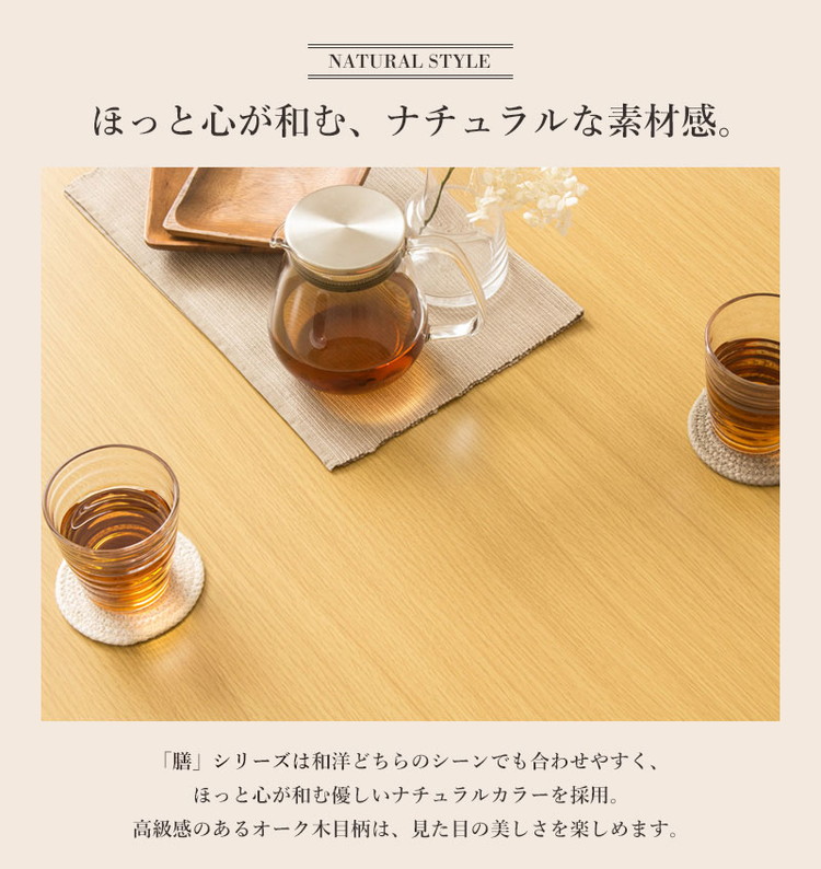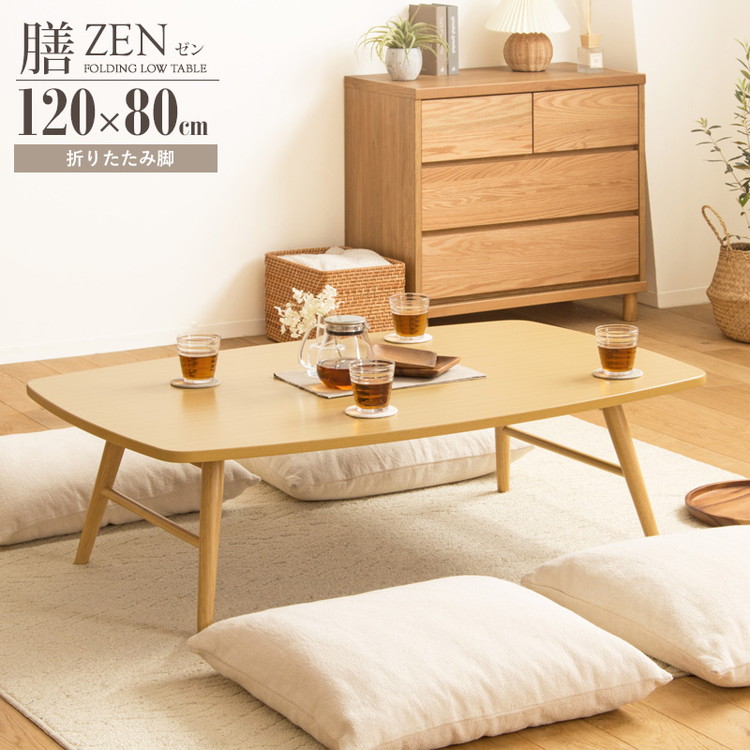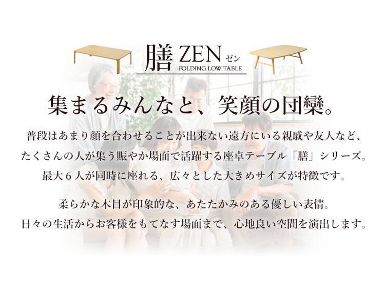 シンプルなデザインとぬくもりのある佇まいが、長く愛されロングセラーになっている折りたたみ座卓テーブル「膳/ゼン」から、デザイン性を高めたモダンタイプが新登場。 和室にも洋室にも合わせやすく、幅広い年齢層、様々なライフスタイルにマッチ。 大人4〜6人でお使いいただける大判サイズで、ご家族のだんらんの中心にぴったりです。 脚部が折りたためるため移動が簡単で、来客時のテーブルとしてもご利用いただいている方も多く、お盆前や年末年始の前には特に人気です。 天板はキズや汚れに強いUV塗装仕上げで、綺麗な状態で長くご使用いただけます。