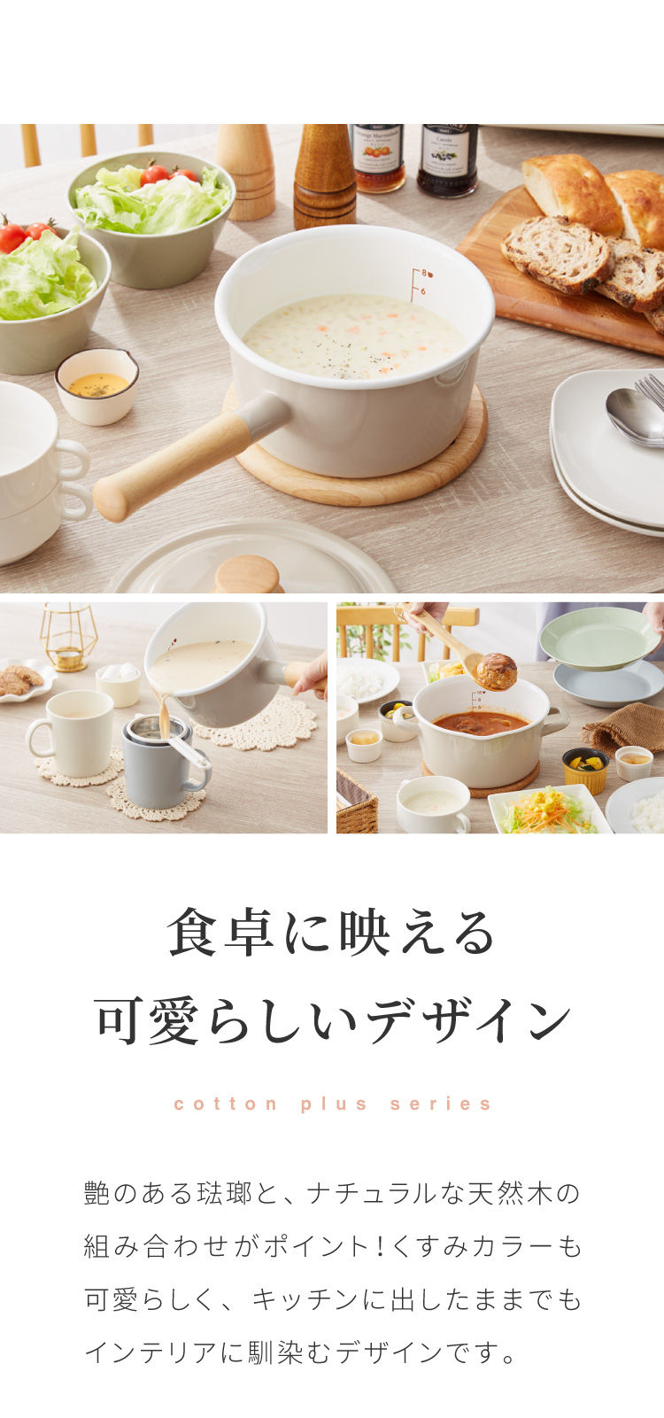 琺瑯×天然木の質感が特徴のコットンプラスシリーズ。