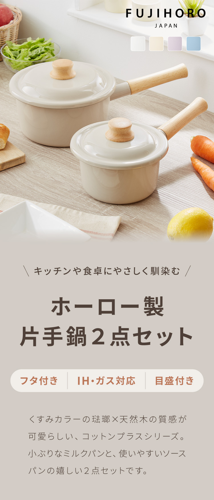 富士ホーロー コットンプラス ミルクパン14cm+ソースパン18cm 2点セット フタ付き ガス火・IH対応 片手鍋 ホーロー鍋 可愛い かわいい 琺瑯 ほうろう