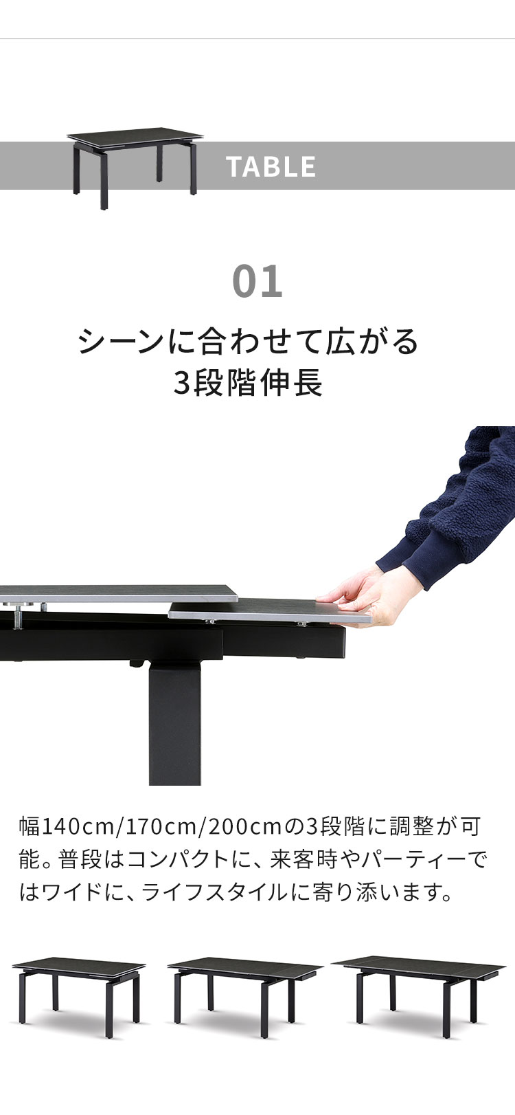 テーブル:幅140〜200×奥行90×高さ72cm