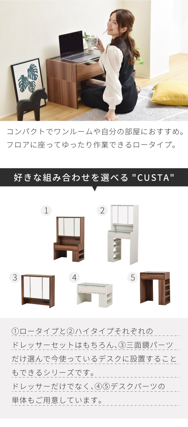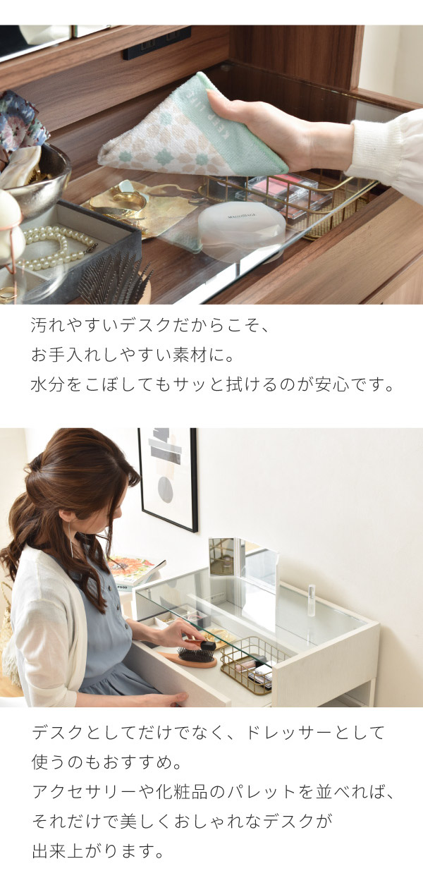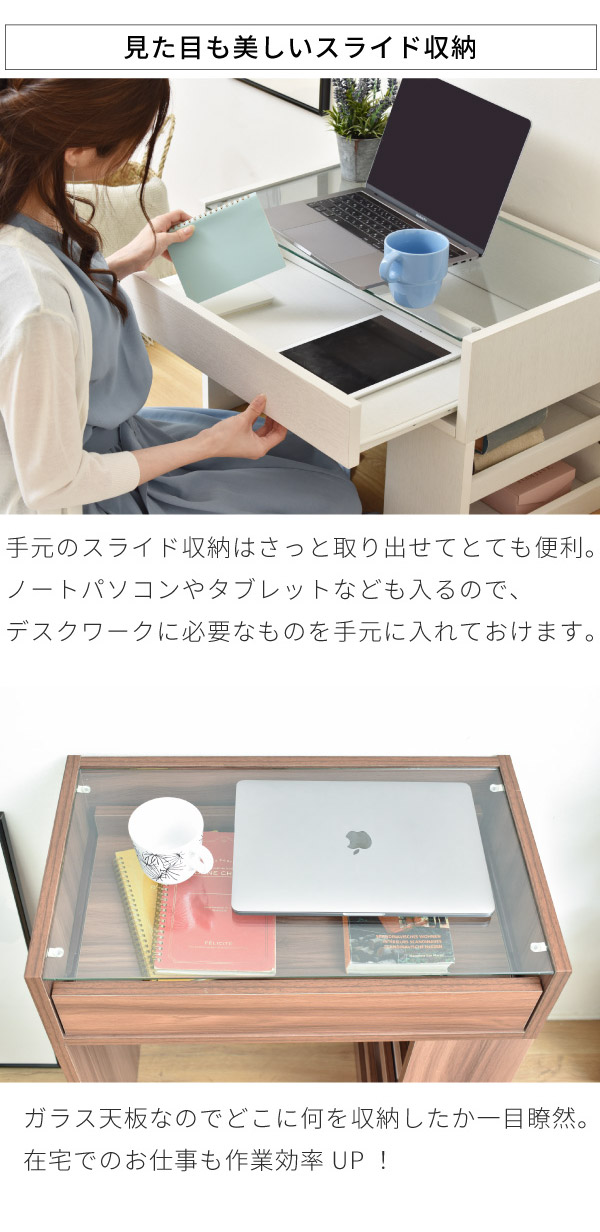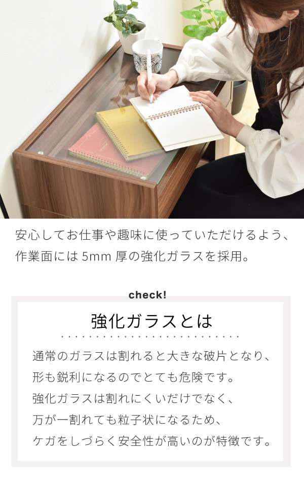 美しいガラストップが特徴的なローデスク。引き出しの中に入れたものが見えるので、お気に入りの筆記用具を収納すれば見た目も一層おしゃれになります。コンパクトなのでひとり暮らしのお部屋のデスク兼ドレッサーにもぴったりです。