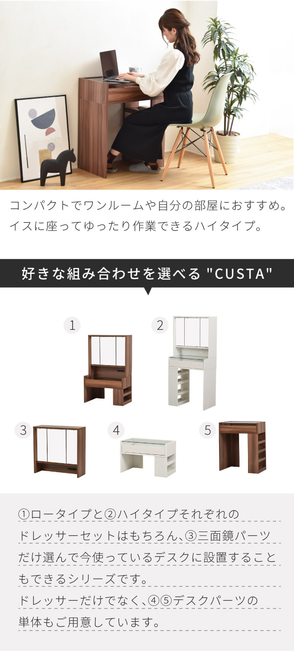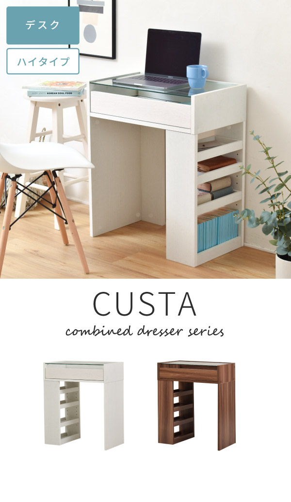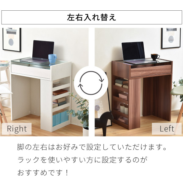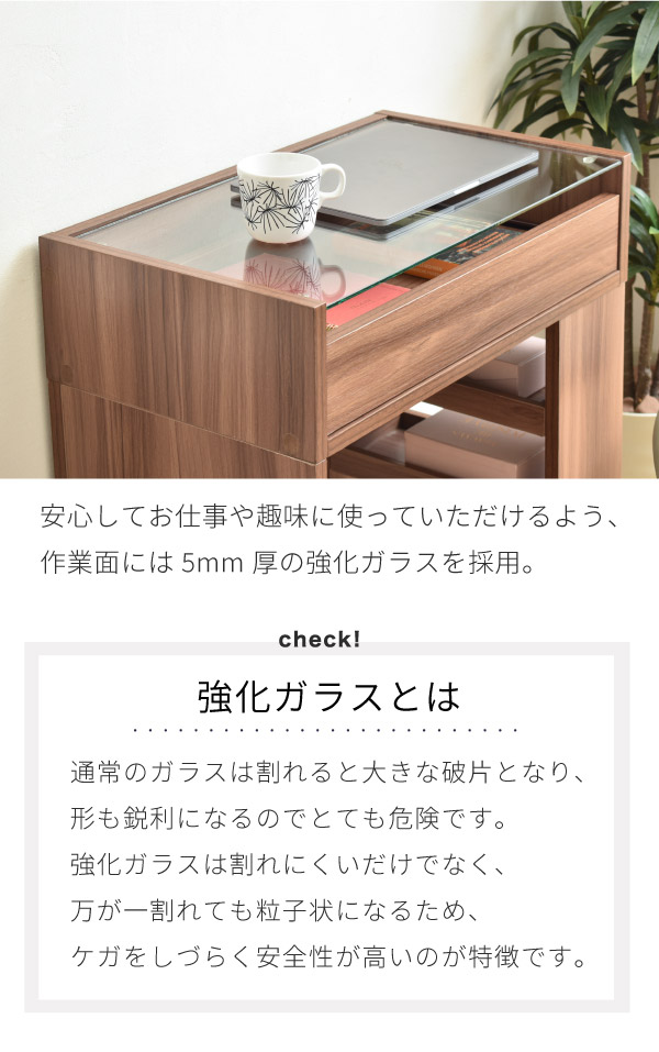 美しいガラストップが特徴的なハイデスク。引き出しの中に入れたものが見えるので、お気に入りの筆記用具を収納すれば見た目も一層おしゃれになります。サイドには可動式の棚も付いているので本や雑貨などもたっぷり収納できます。