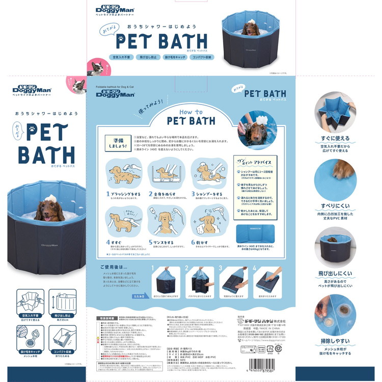 シャンプーの際に使用するペット用バス。空気入れが不要でさっと広げて使える。使用後は折り畳みできる。