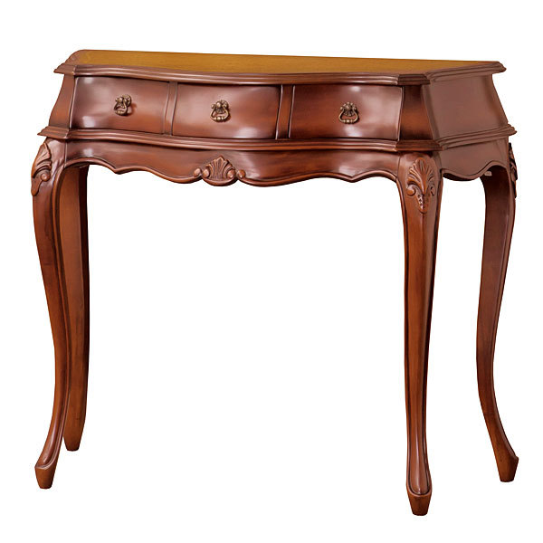天板はレザー調の特殊な仕上げになっておりますので、高級感があります。 ネコ脚、手彫り仕上げ、引出内部の底はフェルト貼りなど、細部にまで工夫を凝らしております。玄関やリビングでもお使いください。