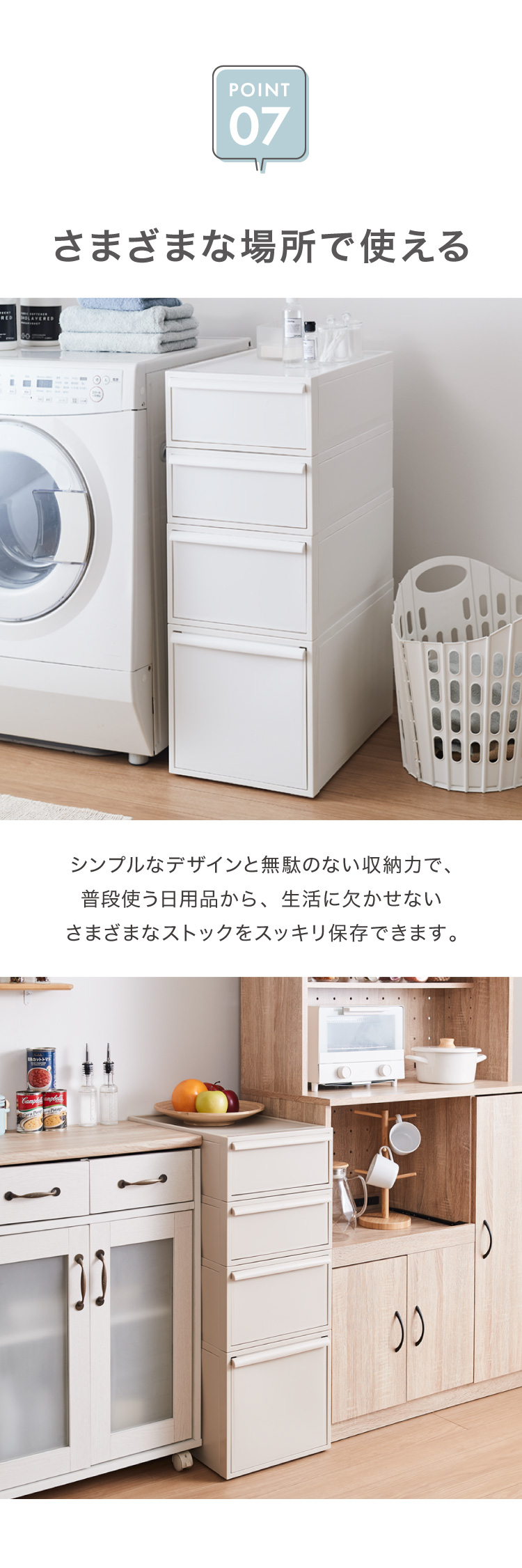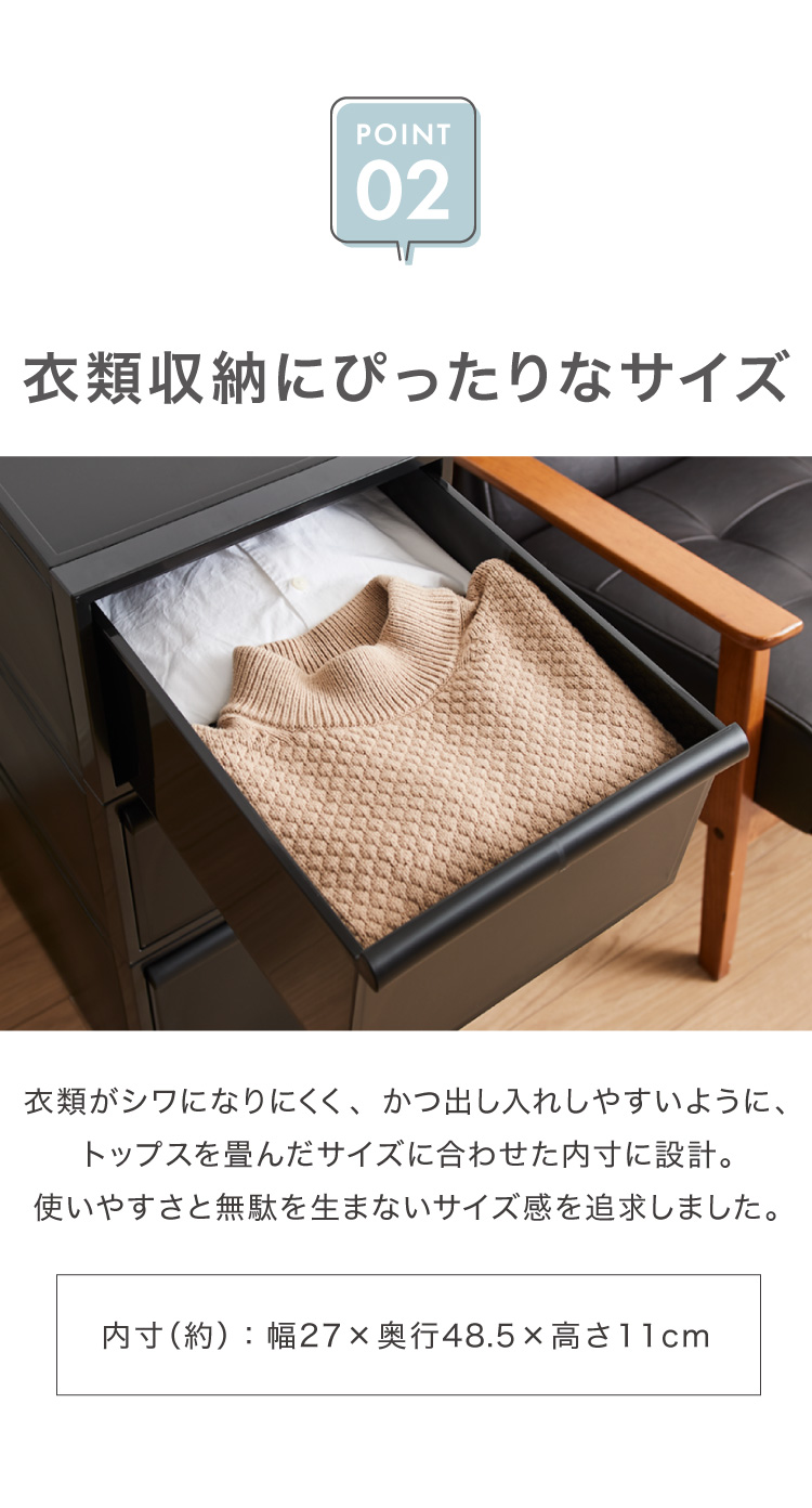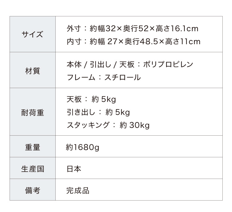 耐荷重:天板/5kg 引出し/5kg スタッキング/最大約30kg