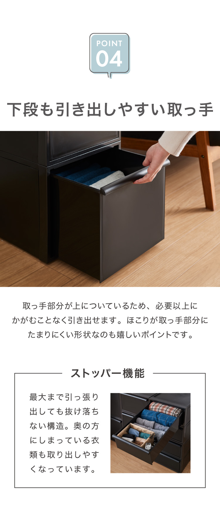 抜け落ち防止構造で引き出した際の落下を防止します
