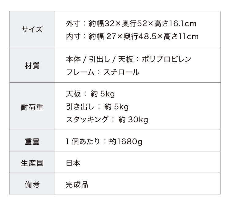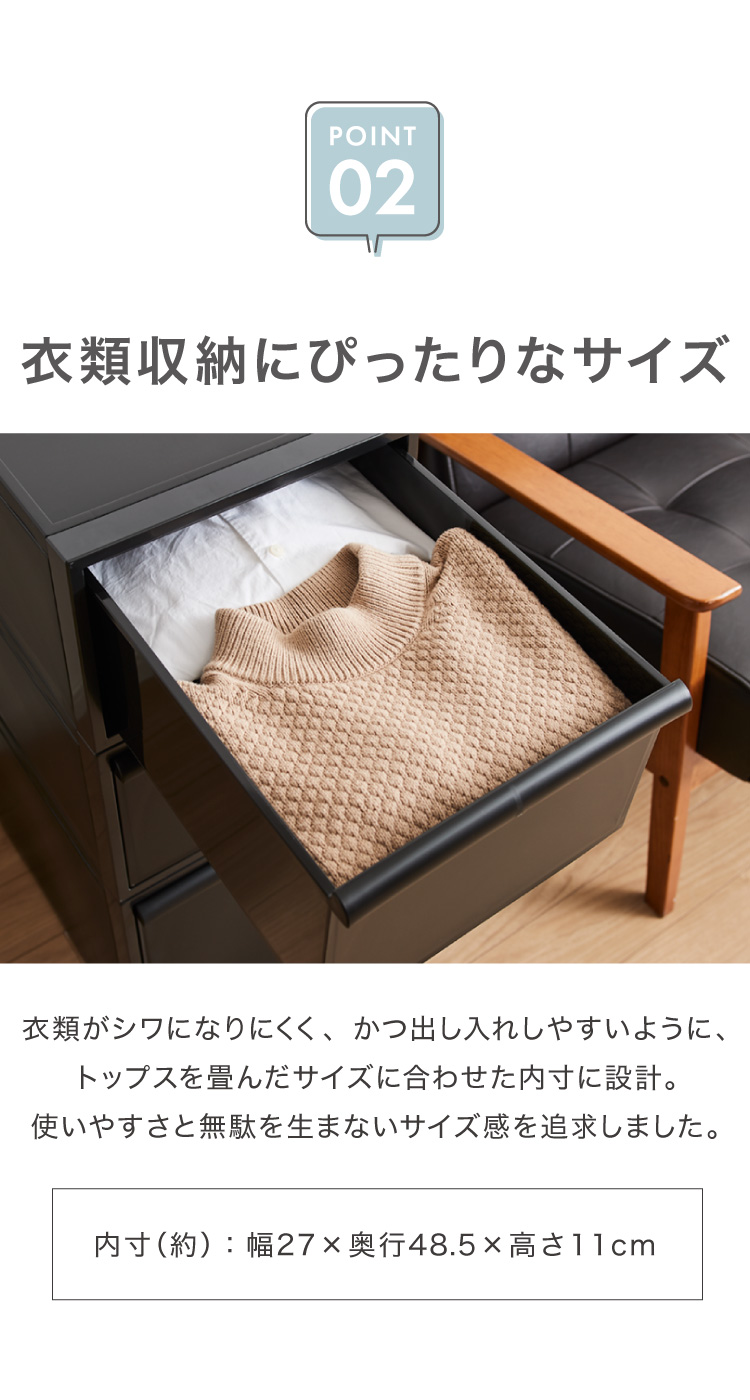 シャツやニット製品等の畳んだサイズにこだわった引出し内寸サイズ。