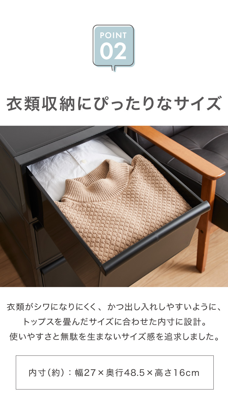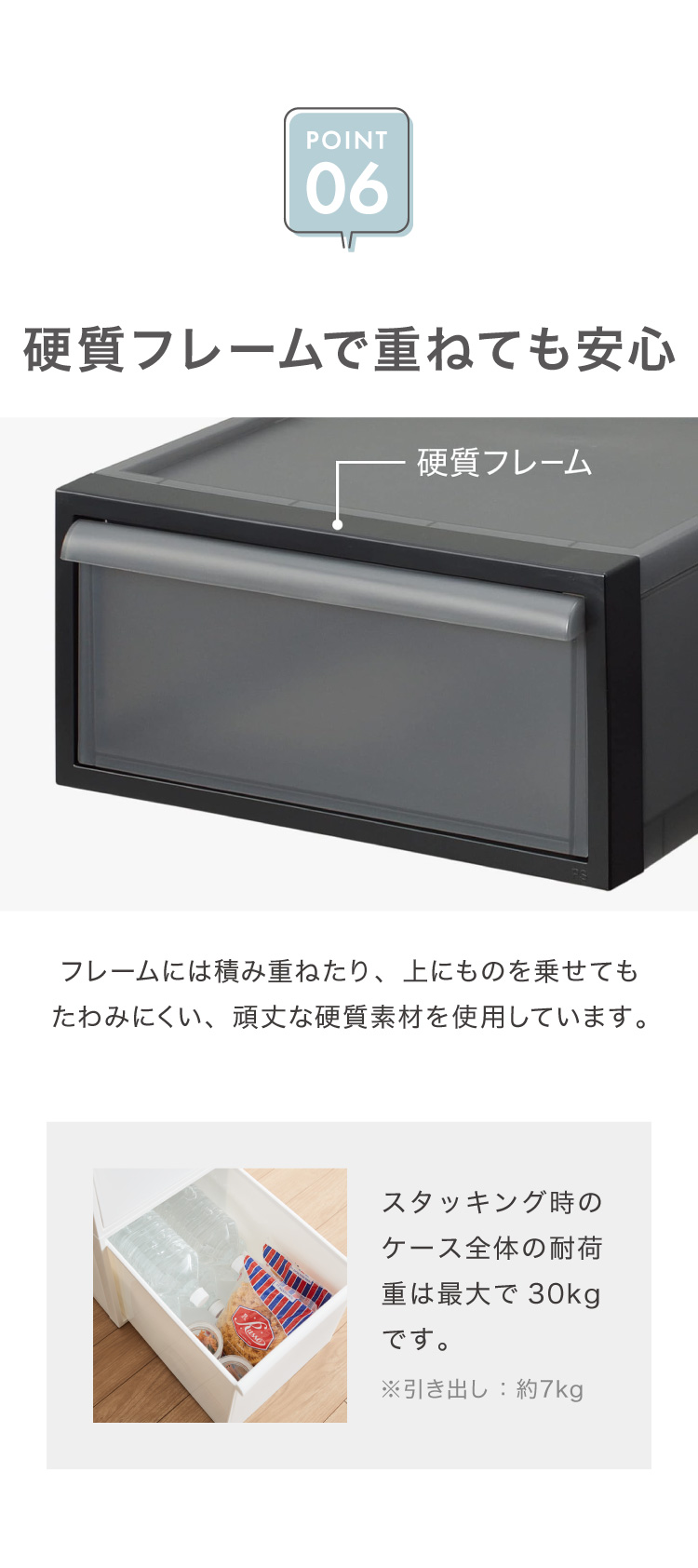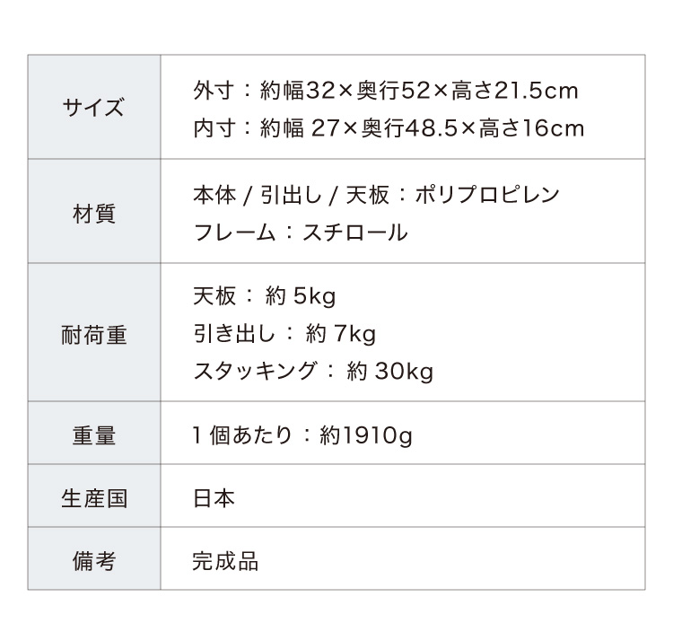 耐荷重:天板/5kg 引出し/5kg スタッキング/最大約30kg