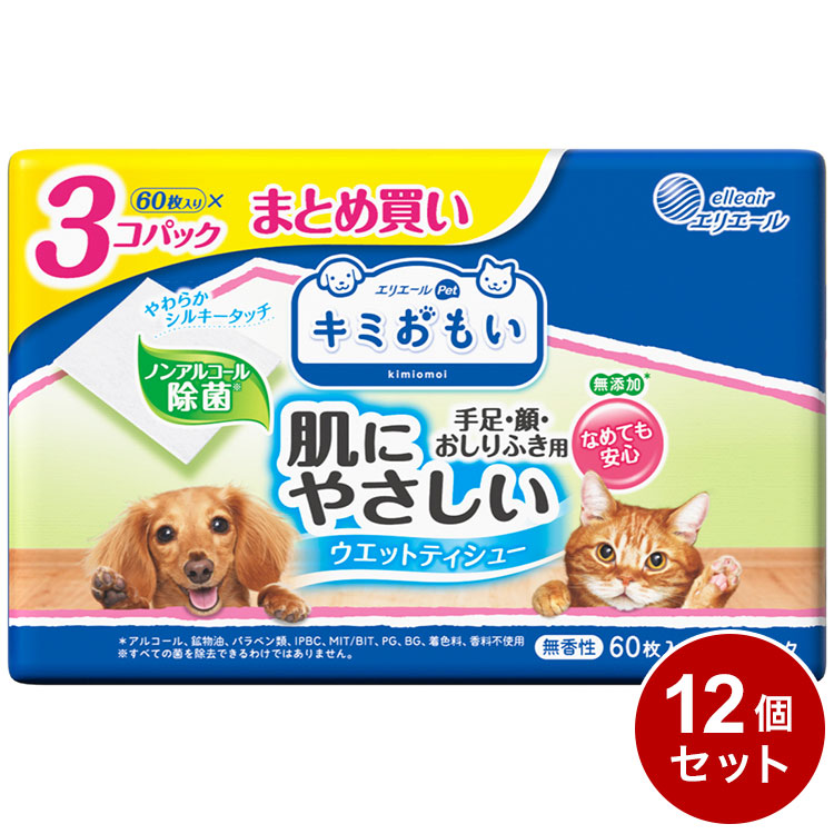 12個セット エリエールペット キミおもい ウエットティシュ― ノンアル 60×3 ペット用 ウェットティッシュ 犬用 猫用 ノンアルコール 除菌