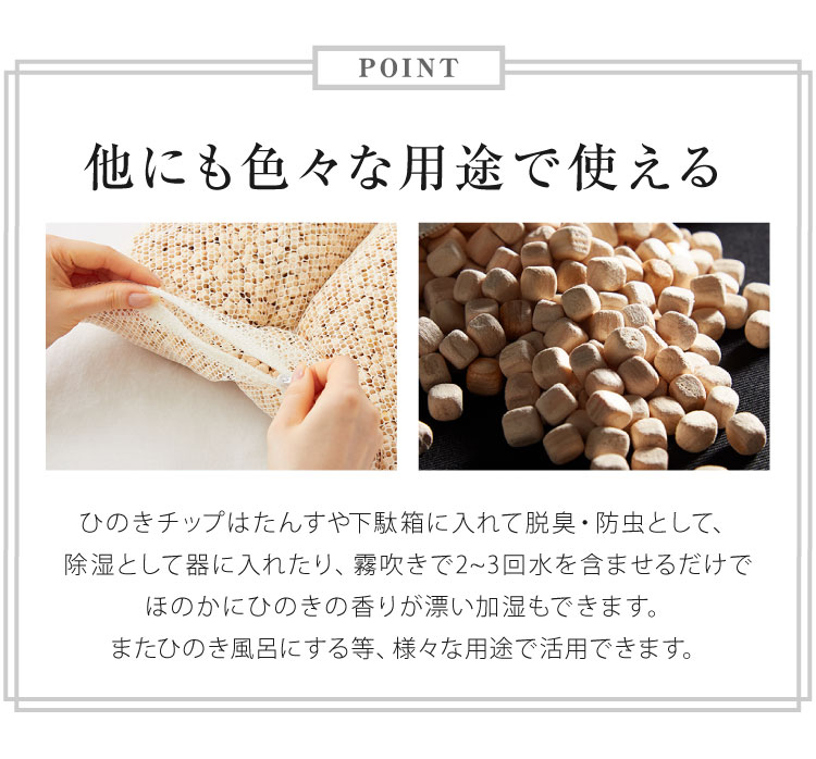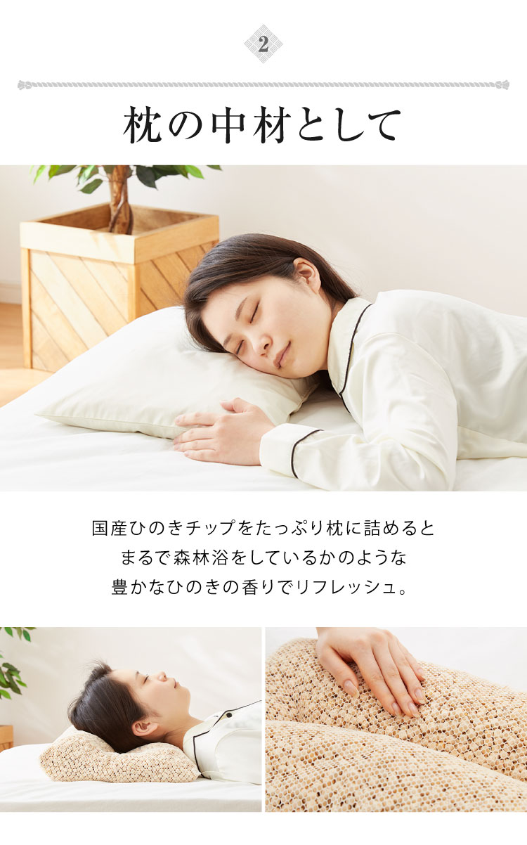 国産ヒノキを使用した枕の詰め替え用チップは、自然の香りとほどよい硬さで快適な眠りをサポートします。
