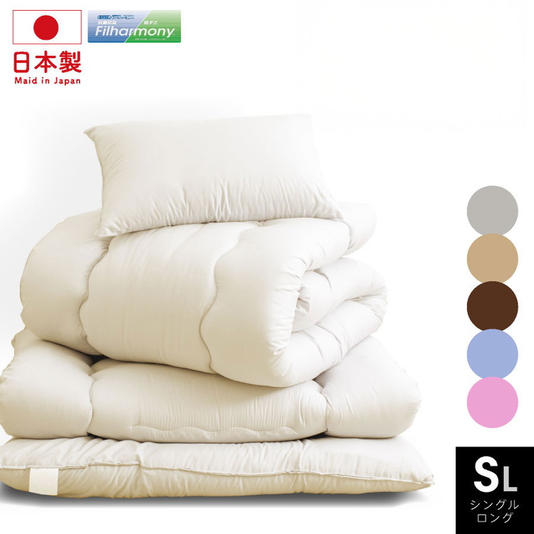 詰め物 【掛け】中空ポリエステル綿100%/東洋紡フィルハーモニー使用(1.5kg) 【敷き】中空ポリエステル綿100%/東洋紡フィルハーモニー使用(2.5kg) 【枕】中空ポリエステル綿100%(0.5kg)