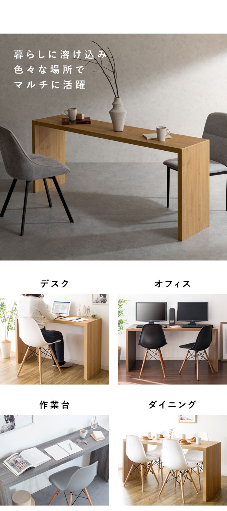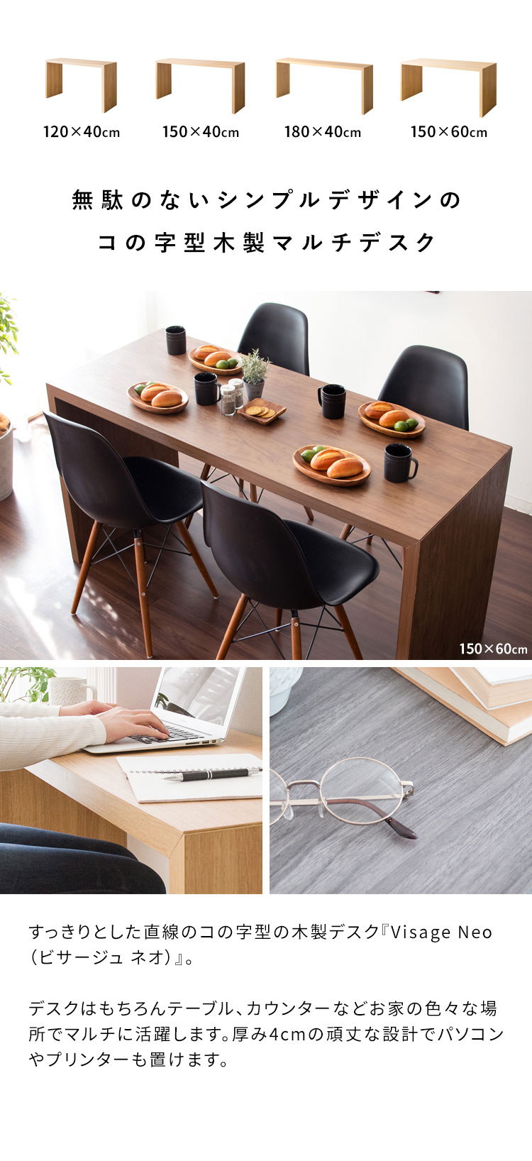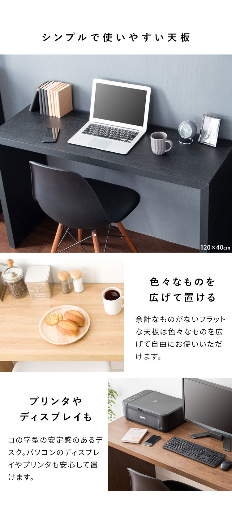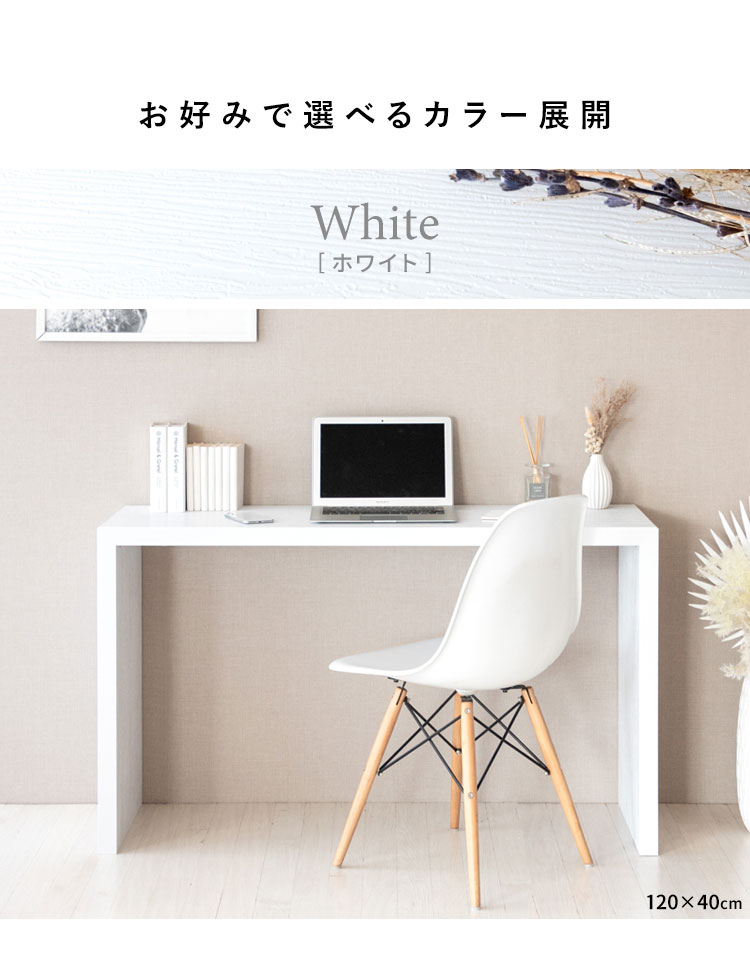 シンプルなデザインはデスクだけでなくテーブル、カウンター、ディスプレイスタンドなどお家の色々な場所でマルチに活躍します。厚み4cmの頑丈な設計でパソコンやプリンターも置けます。