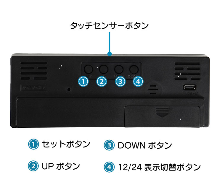 機能時刻表示、12/24時間表示切替、夜間自動減光、(電池使用時)スリープモード/タッチセンサー