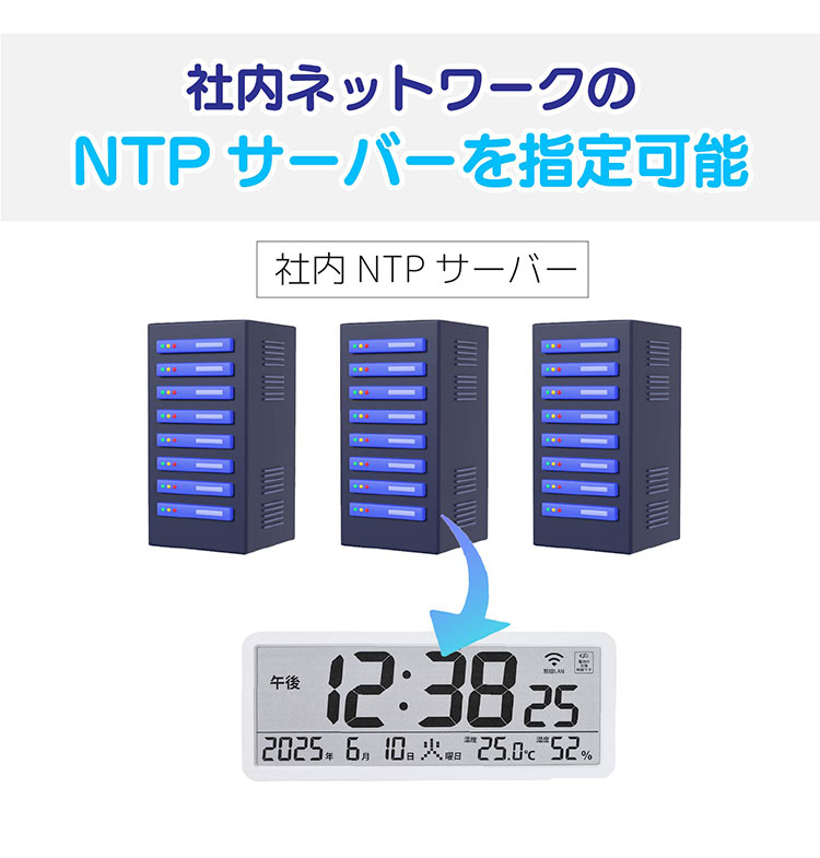 ・無線LAN・時刻表示・カレンダー表示・温度/湿度表示・電波受信状況表示・受信マーク・12/24時間表示切替・電池交換お知らせ表示・置掛兼用・タイムゾーン(時差)設定・NTPサーバー設定機能・定期受信時刻設定機能(1回/日)・希望時間設定可能