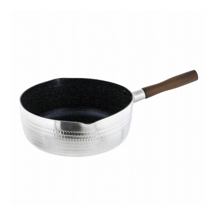 内面フッ素樹脂加工で傷に強くこびりつきにくい雪平鍋。内面ふっ素樹脂塗膜加工はダイキンEK(耐摩耗性試験50万回クリア)を使用。傷に強く汚れがこびりつきにくい。 角の丸い金属ヘラOK。内面には便利な分量目盛り付。汁物を注ぐときに便利な両側注ぎ口付。アルミ槌目加工で優れた強度。